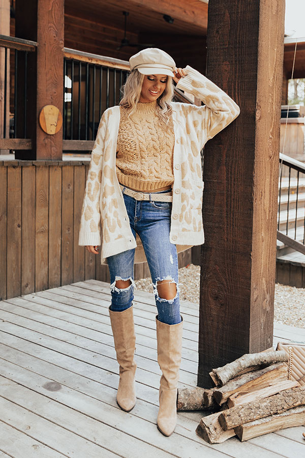 Premiere your fall wardrobe beautifully with this seasonal light khaki colored sweater featuring thick cable knit material, ribbed trim detailing, a rounded neckline, long loose sleeves, and a slouched silhouette that falls into a straight hemline!