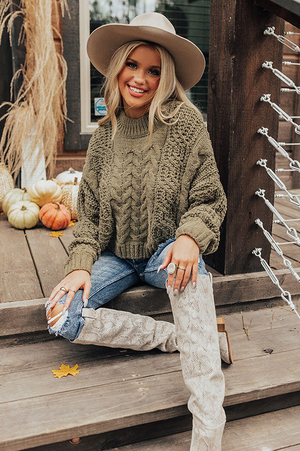 Premiere your fall wardrobe beautifully with this seasonal olive colored sweater featuring thick cable knit material, ribbed trim detailing, a rounded neckline, long loose sleeves, and a slouched silhouette that falls into a straight hemline! Measurements