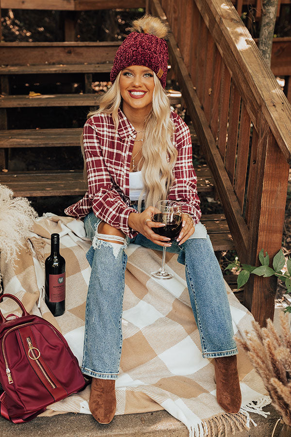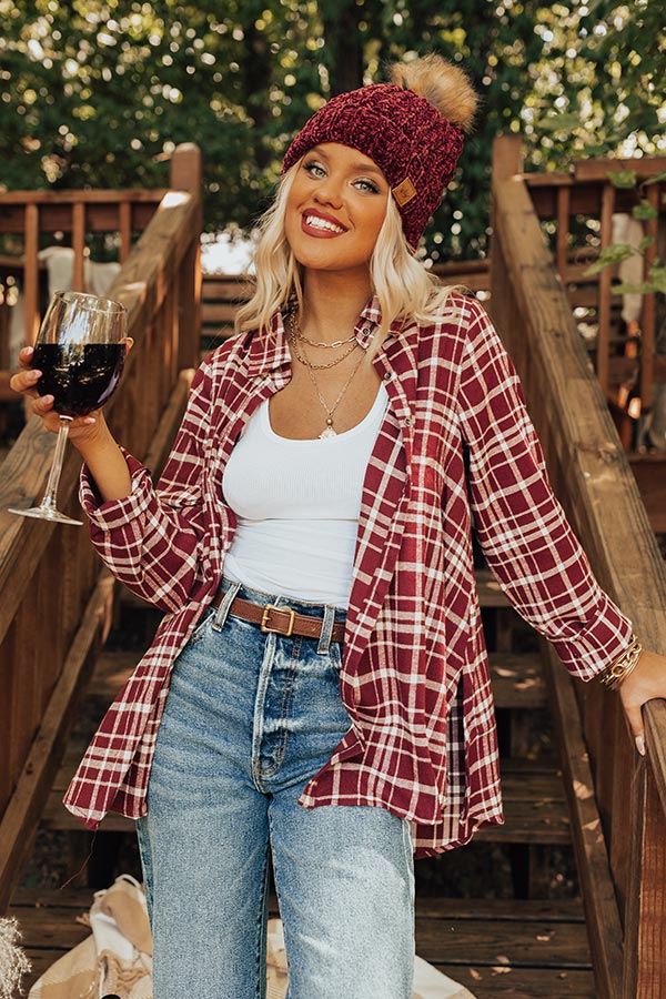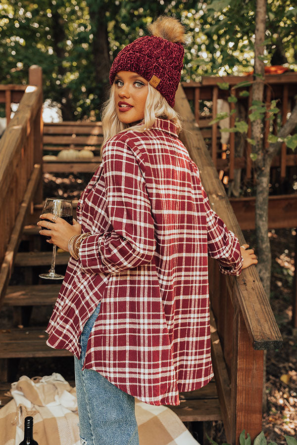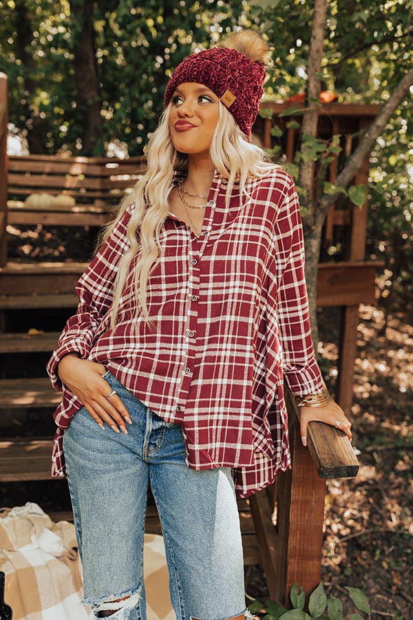 Get into the rhythm of the season with this adorable wine hued top featuring lightweight material patterned with a white plaid print, a button up front with a collared neckline, long loose sleeves with button closure cuffs, and a relaxed silhouette that falls into a rounded hemline! Measurements