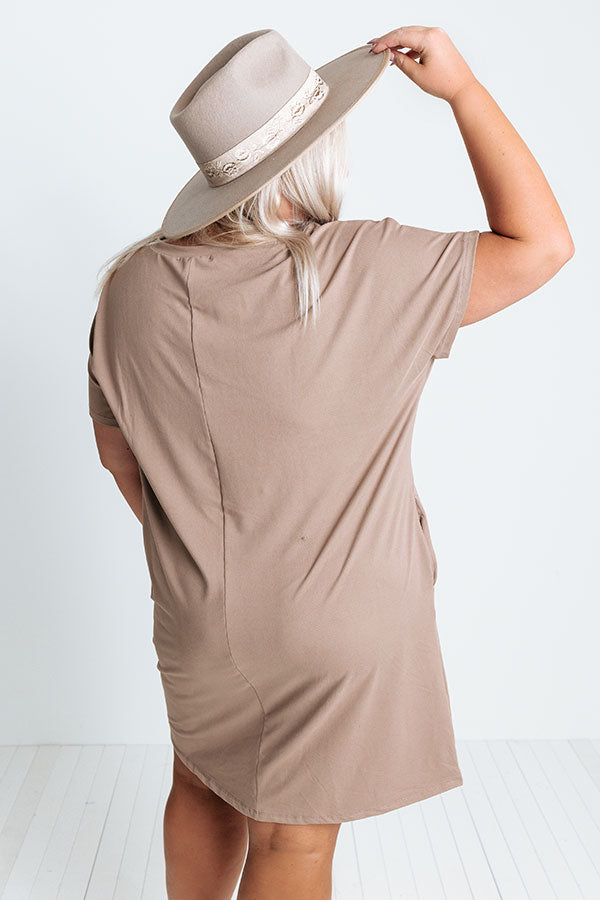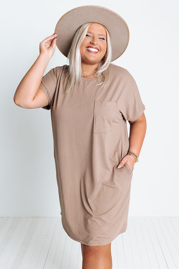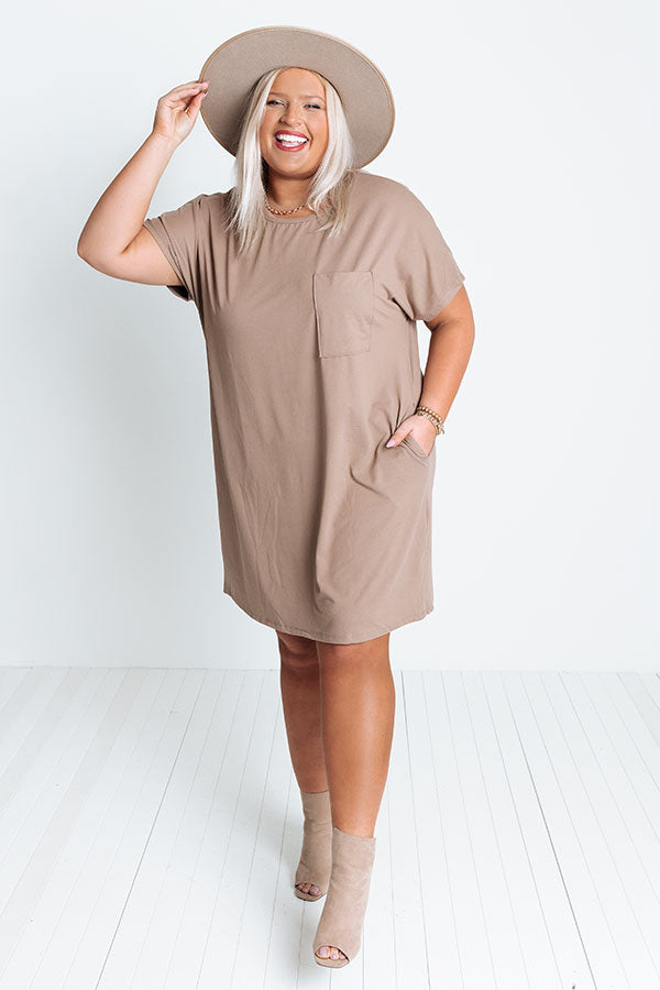 Stay casual but cute in our basic plus size mocha colored 'Seasonal Rhythm T-Shirt Dress' featuring soft lightweight and flowy material, a rounded neckline, short loose sleeves, a single accent chest pocket, and a relaxed silhouette that falls into a straight mid-thigh length hemline!