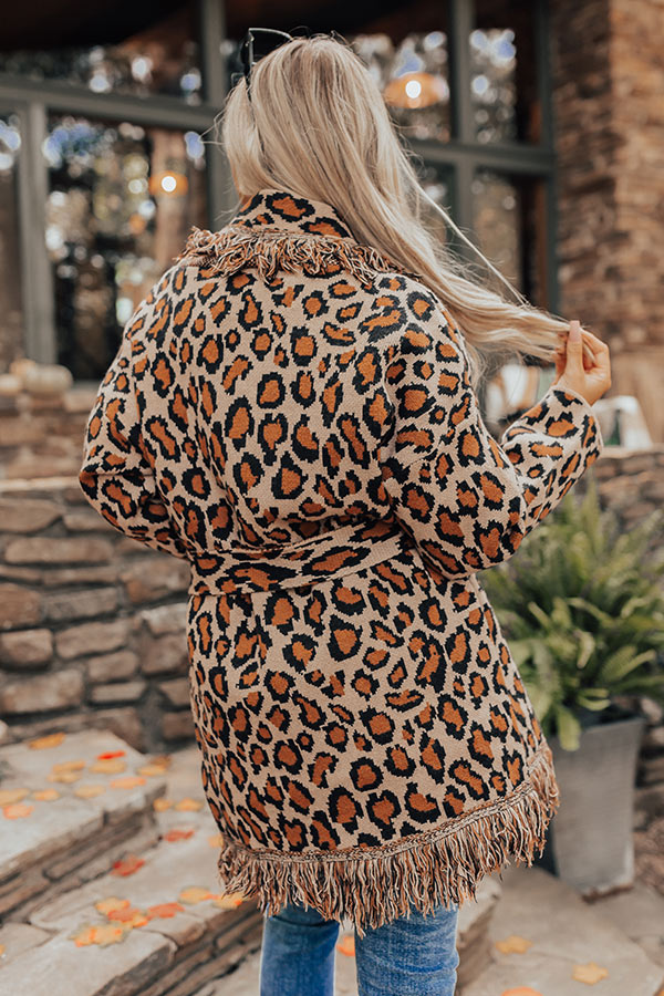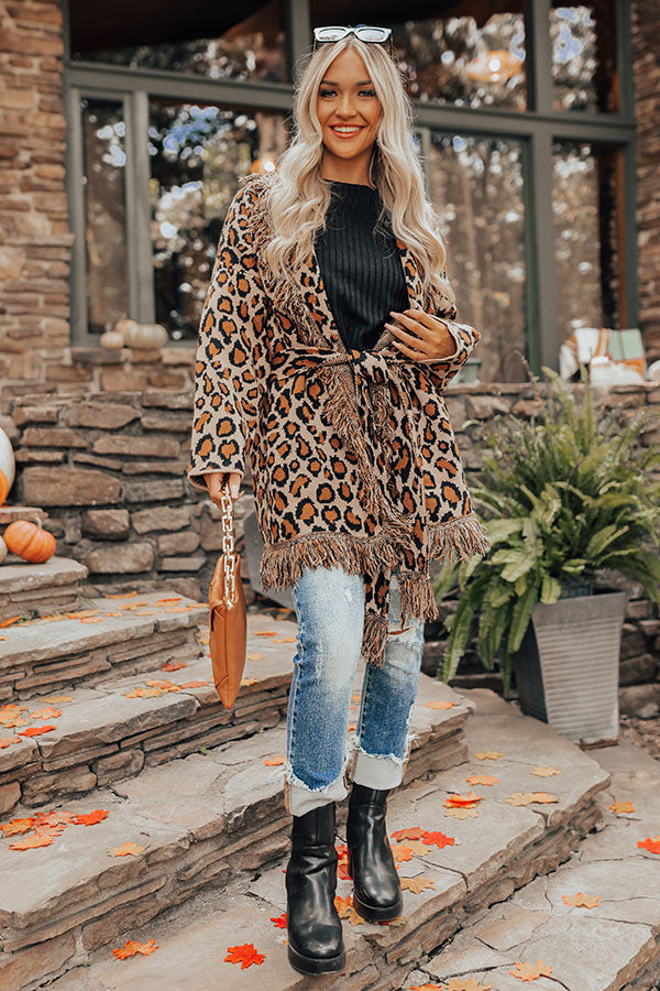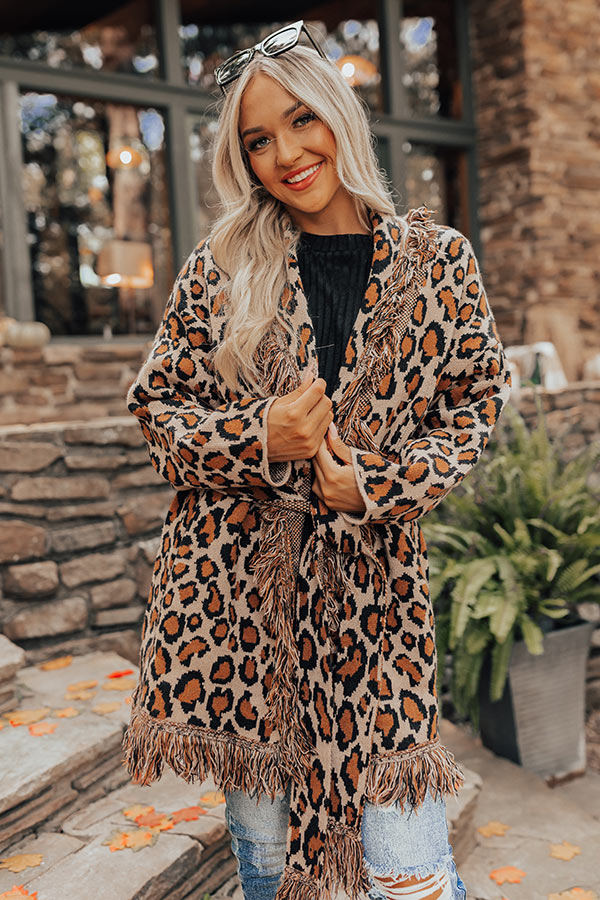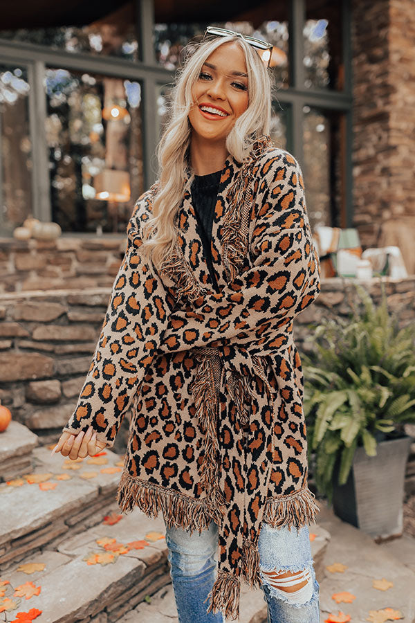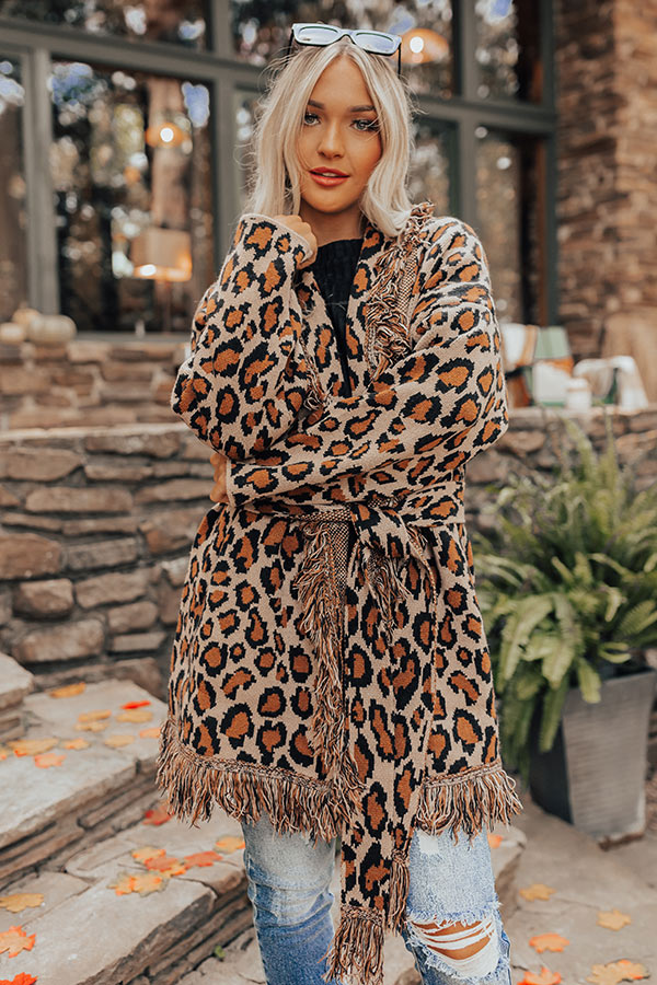 Take a walk on the wild side in our adorable 'Seasonal Treats' cardigan featuring thick and warm knit material patterned with a black and camel leopard print, ultra fringe trim detailing, long loose sleeves, an open front with an optional matching tie belt, and a relaxed silhouette that ends in a straight mid-thigh length hemline!