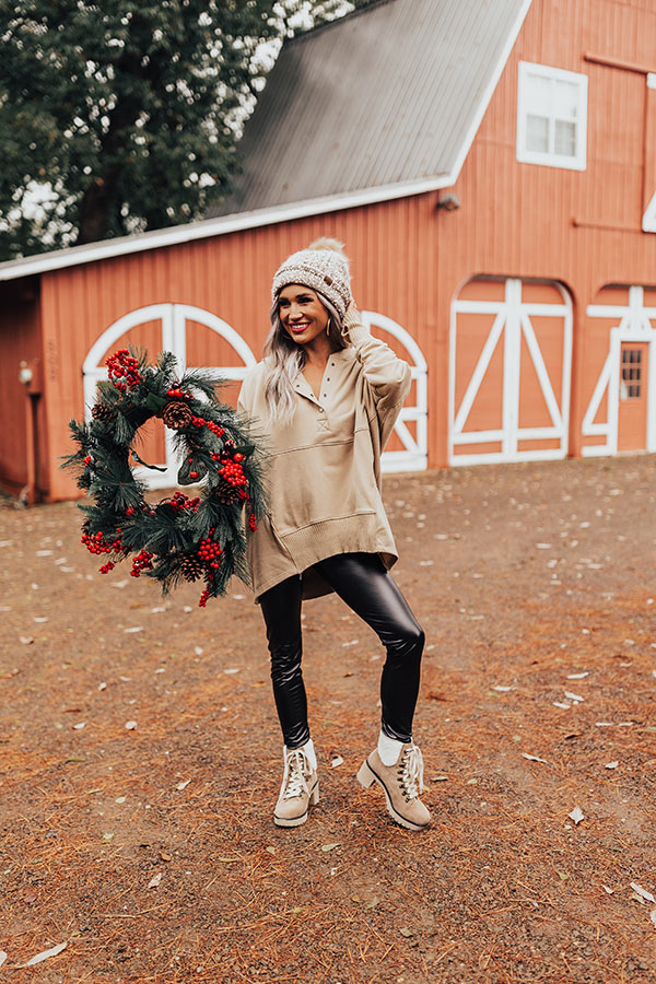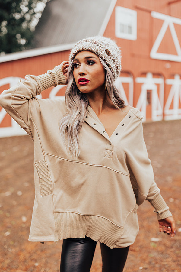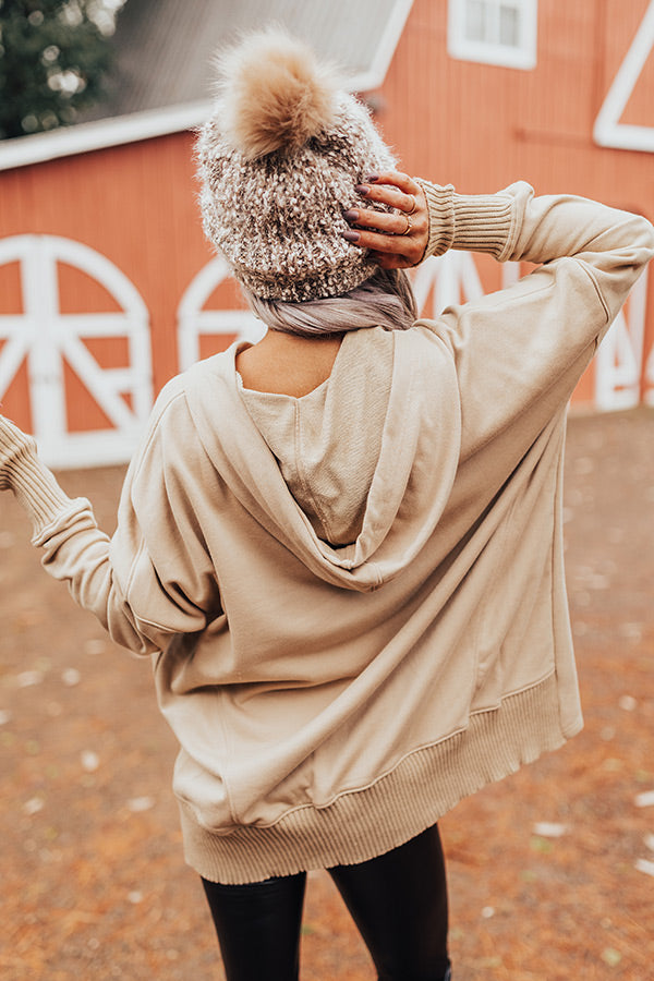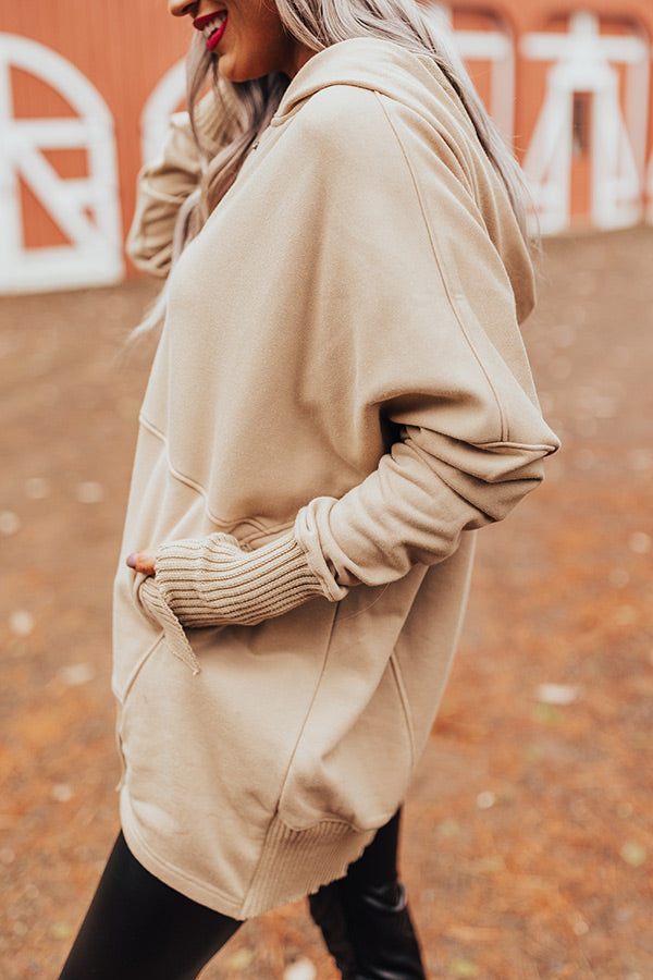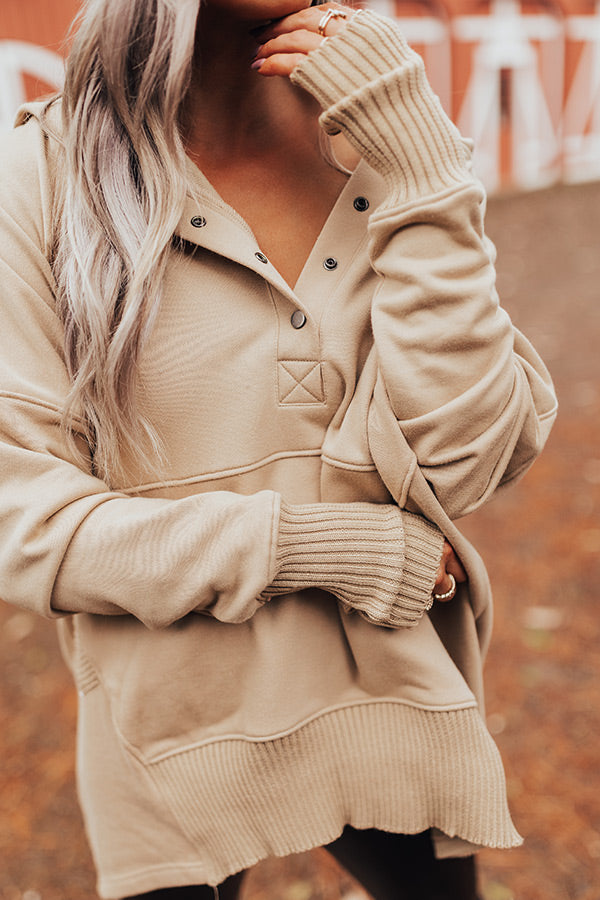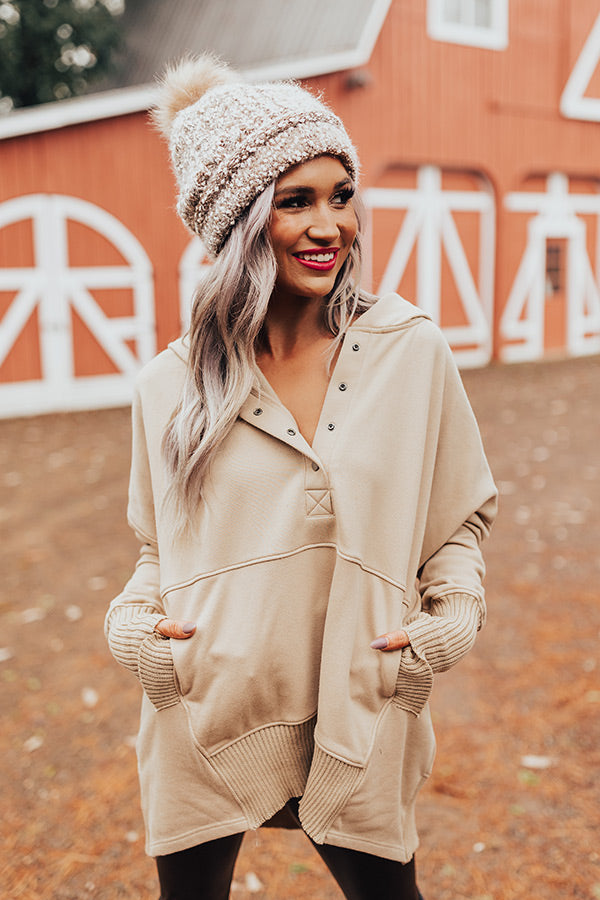 Keep warm as the seasons change in this iced latte hued casual cute hoodie featuring soft and lightweight material, a button up bodice, a rounded neckline with a hooded back, long loose sleeves with ribbed cuffs, an oversized kangaroo front pocket, and a relaxed silhouette that falls into a straight hemline! Measurements