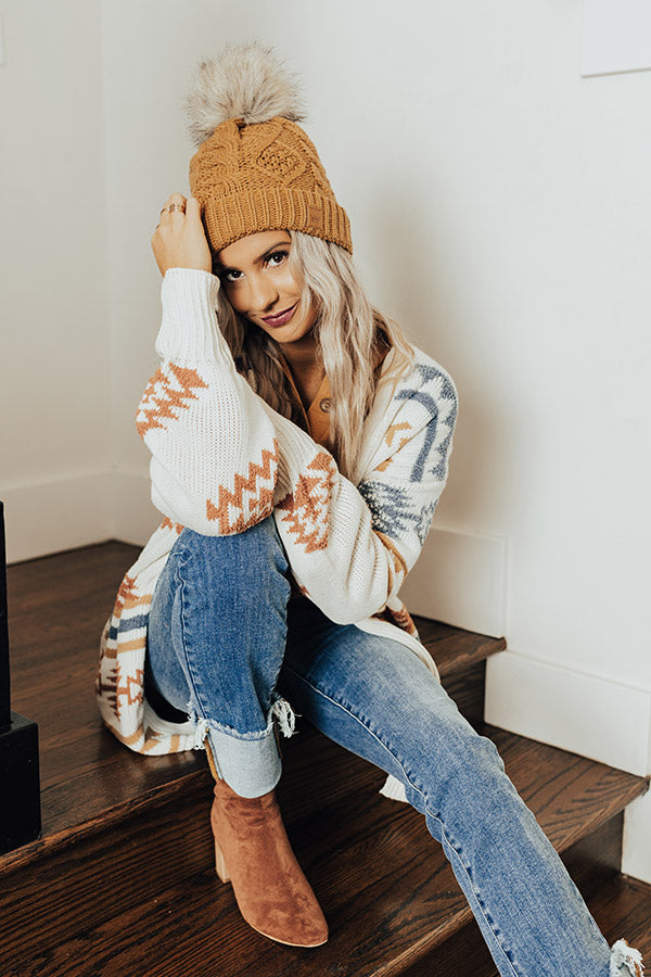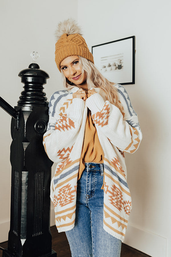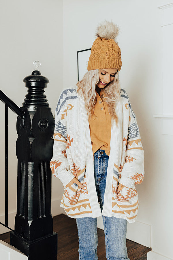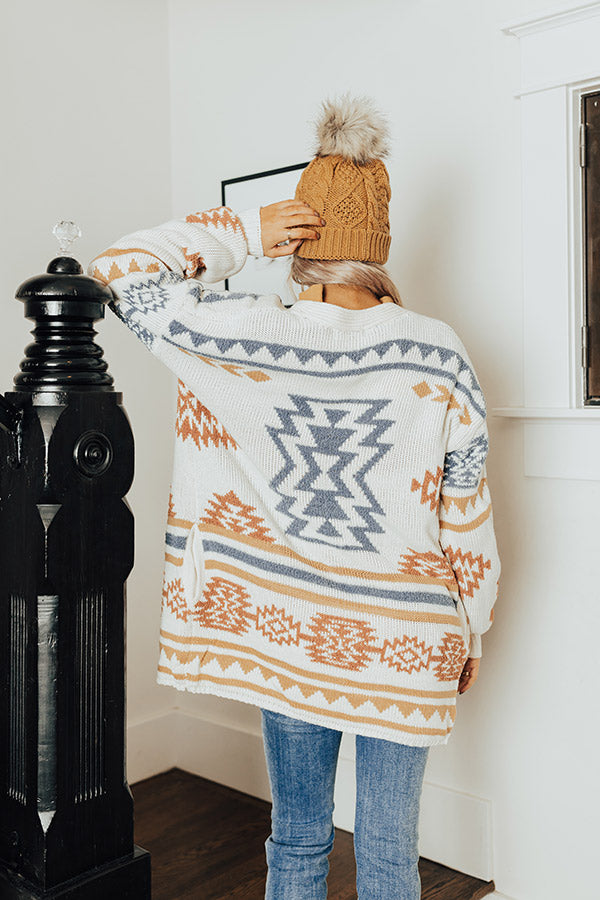As the seasons keep changing, keep your wardrobe updated with this pretty ivory colored cardigan featuring soft knit material patterned with a brown, natural, and navy hued aztec print, long loose sleeves, low pockets, and a draped open front silhouette that falls into a straight tunic-length hemline! Measurements
