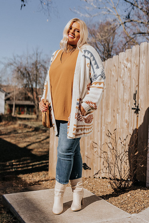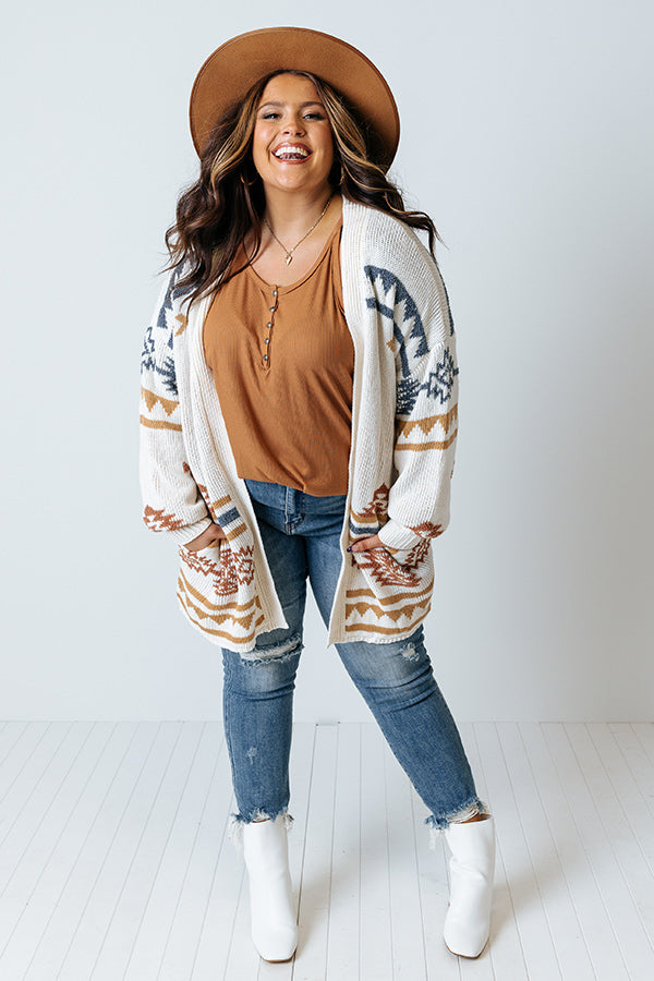 As the seasons keep changing, keep your wardrobe updated with this pretty plus size ivory colored cardigan featuring soft knit material patterned with a brown, natural, and navy hued aztec print, long loose sleeves, low pockets, and a draped open front silhouette that falls into a straight tunic-length hemline! Measurements