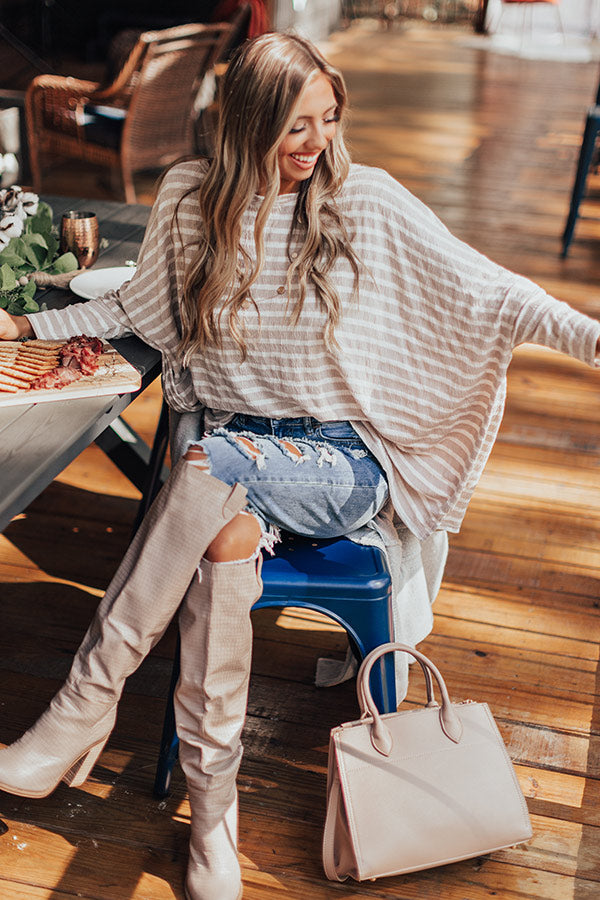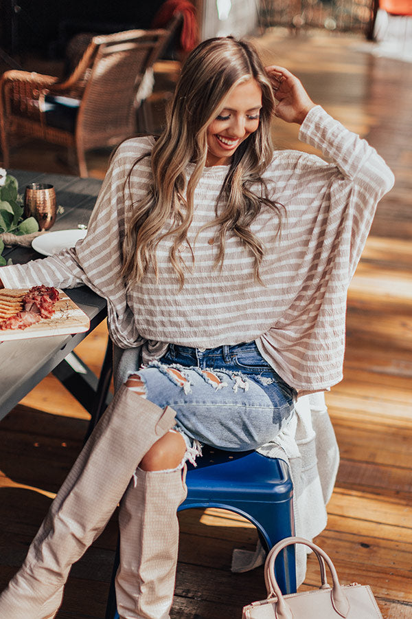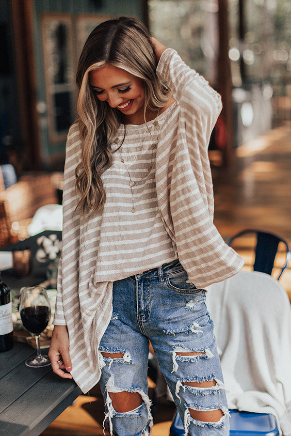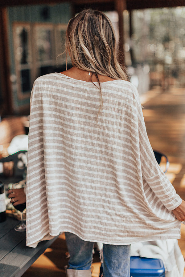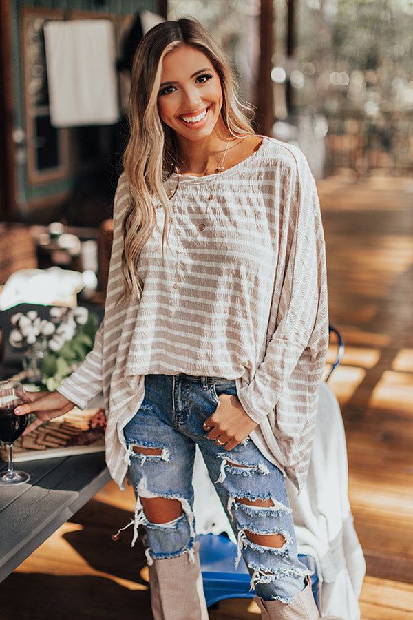 Looking for a piece that is perfect for any casual occasion? Look no further than our adorable "Seattle Breeze" top featuring soft lightweight flowy material patterned with horizontal white and birch colored accent stripes, a high rounded neckline, long bat wink PIKO sleeves with more fitted forearms, and an ultra relaxed silhouette that falls into an uneven tunic-length hemline! Measurements