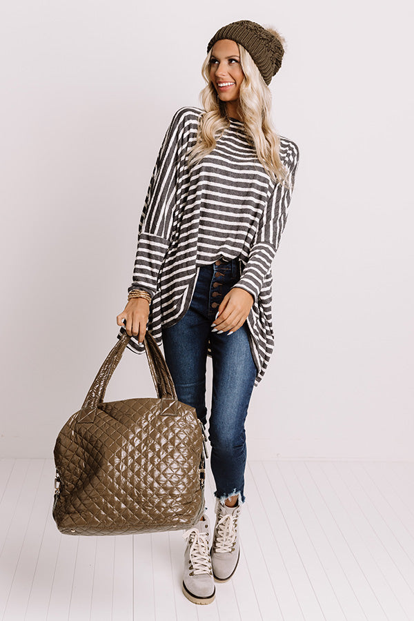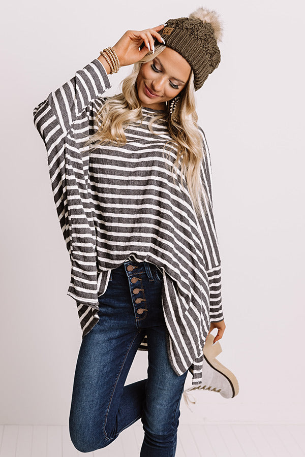 Looking for a piece that is perfect for any casual occasion? Look no further than our adorable "Seattle Breeze" top featuring soft lightweight flowy material patterned with horizontal white and charcoal colored accent stripes, a high rounded neckline, long bat wink PIKO sleeves with more fitted forearms, and an ultra relaxed silhouette that falls into an uneven tunic-length hemline! Measurements