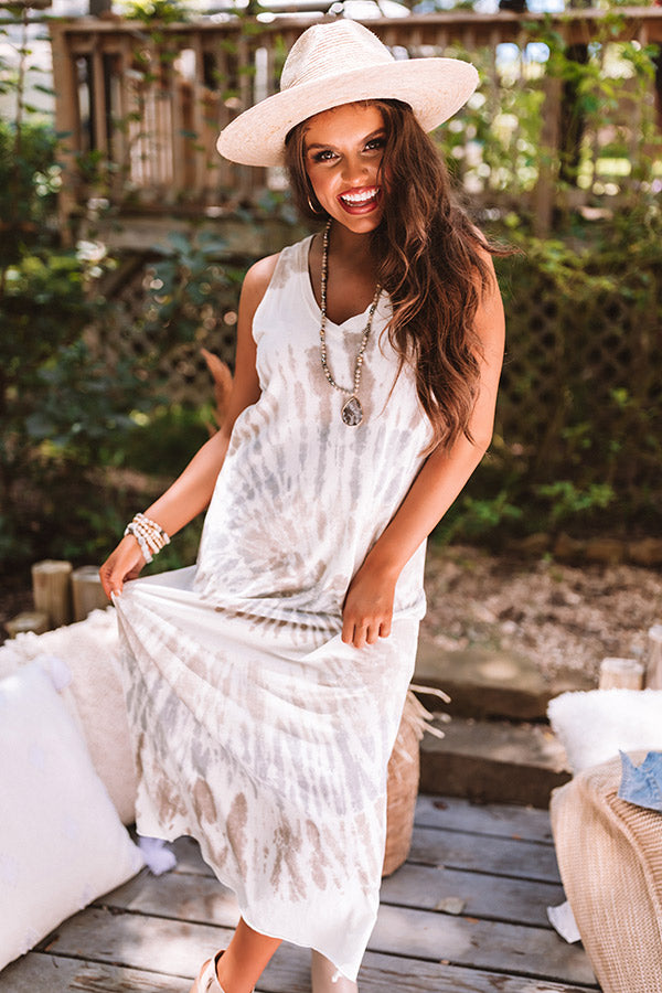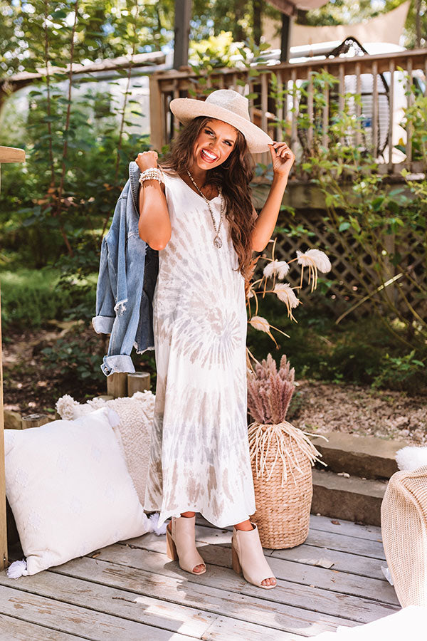 Spend your evening in style with our stunning "Seattle Sunset" maxi dress featuring soft lightweight material patterned with a neutral tie dye, a v-cut neckline, wide 2-inch sleeveless shoulder straps, and a relaxed silhouette that falls into a straight mid-thigh length hemline with accent side slits! We have layered this cutie under a jean jacket with a matching bootie and wool hat, but you can also wear it with the "Steve Madden Marcella Nubuck Heel in Mocha" and our "New On The Block Faux Leather Fringe Tote in Grey!"