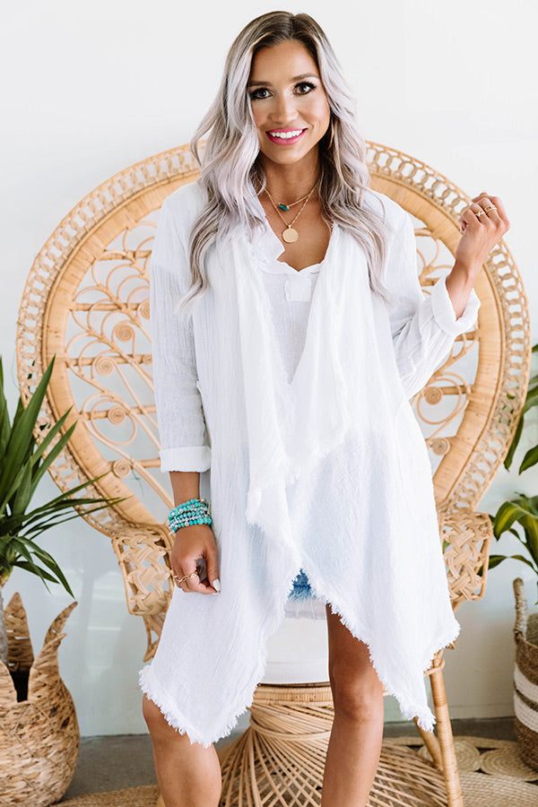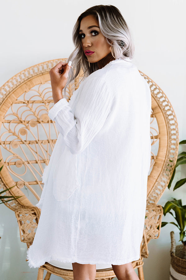 Layer up in style with this casual cute white "Secluded Beach" cardigan featuring soft lightweight tight knit linen material with subtle texturing, long loose sleeves, frayed trim detailing, accent side pockets, and an ultra draped open front silhouette that falls into an straight knee-length hemline! You can pair this versatile piece with just about anything from a basic tank to a sweater, jeans to dresses, wedges to sandals, clutches to totes, and hats to earrings! Measurements