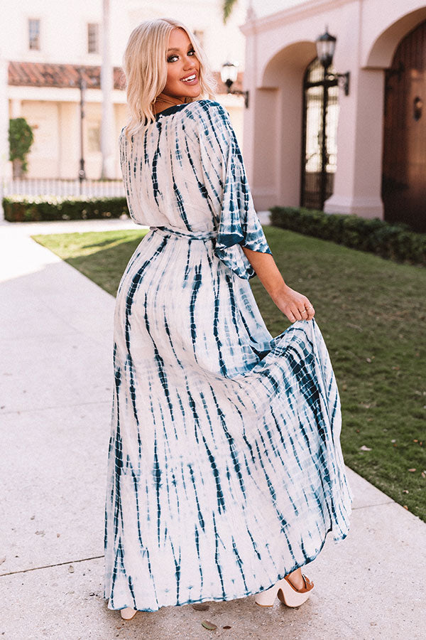 Show up and show out in our gorgeous 'Secluded Shores' maxi dress featuring lightweight flowy material patterned with blue hued tie dye, a wrap bodice with a v-cut neckline, loose 3/4-length sleeves, a tie belt waistline, and an ultra relaxed skirt silhouette that cascades into a straight floor-length hemline with thigh-high accent side slits! Measurements