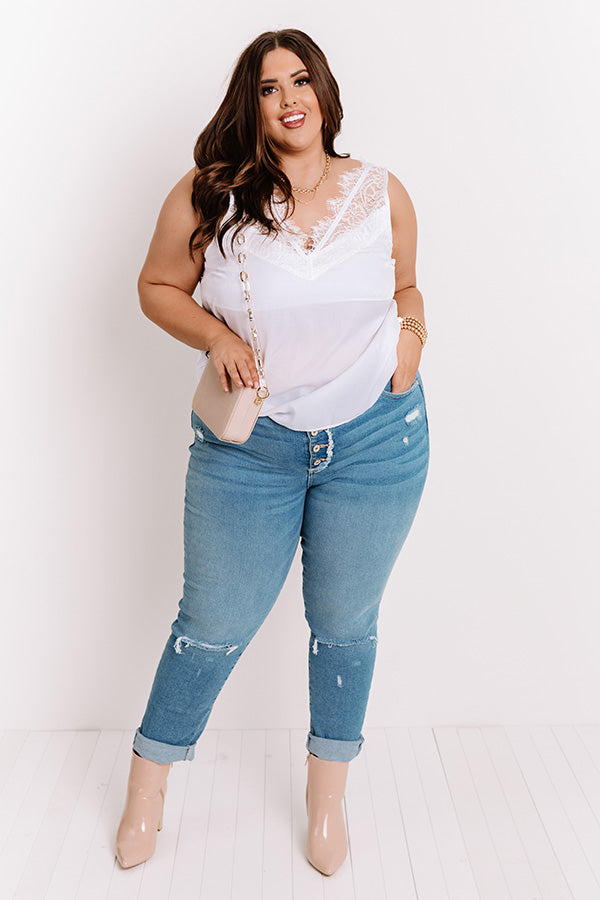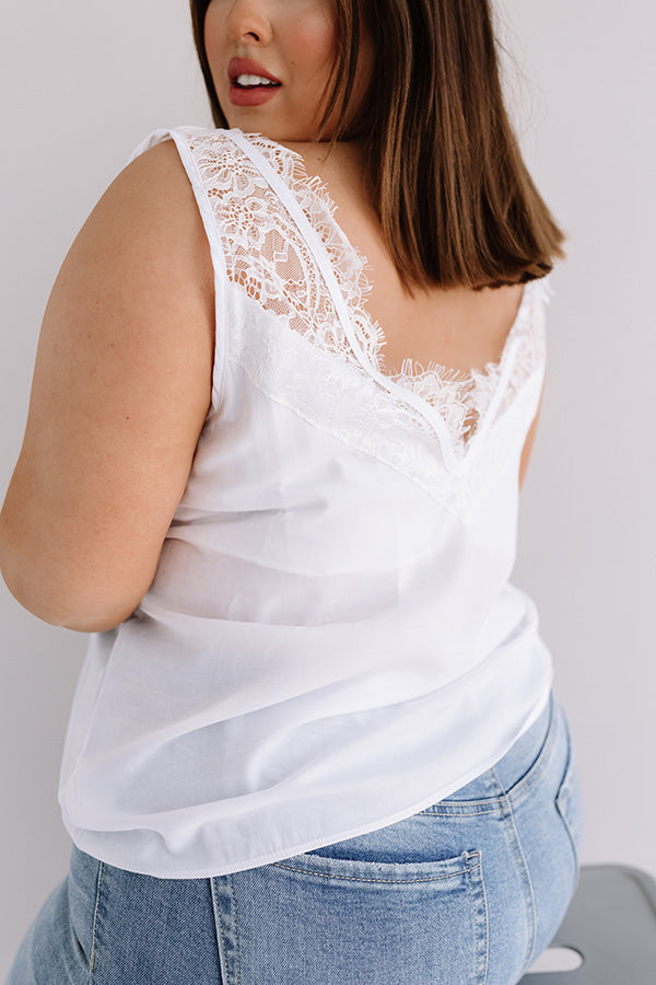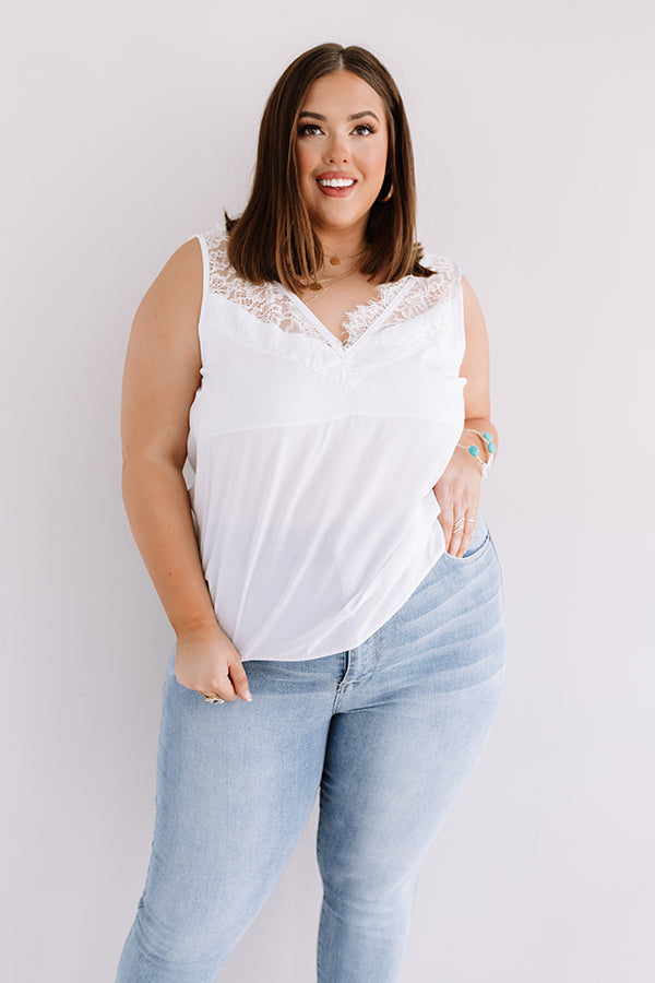 Plus Size - Level up your summer wardrobe with our adorable white 'Second Story' top featuring lightweight material, intricate lace trim detailing across the deep v-cut neckline, upper back, and wide 3-inch sleeveless shoulder straps, and a relaxed silhouette that falls into a straight hemline! Measurements