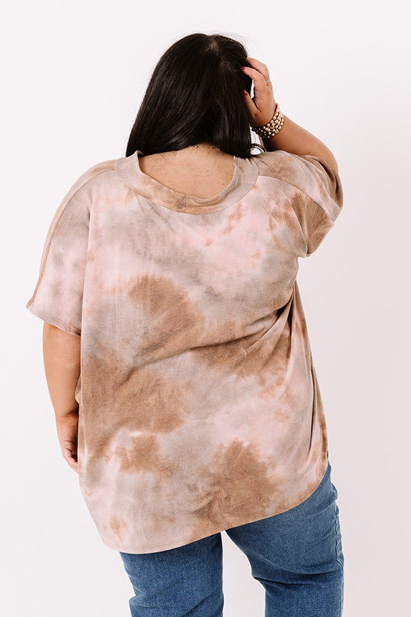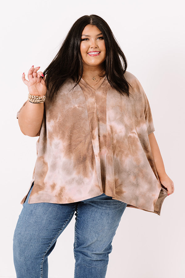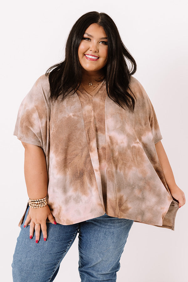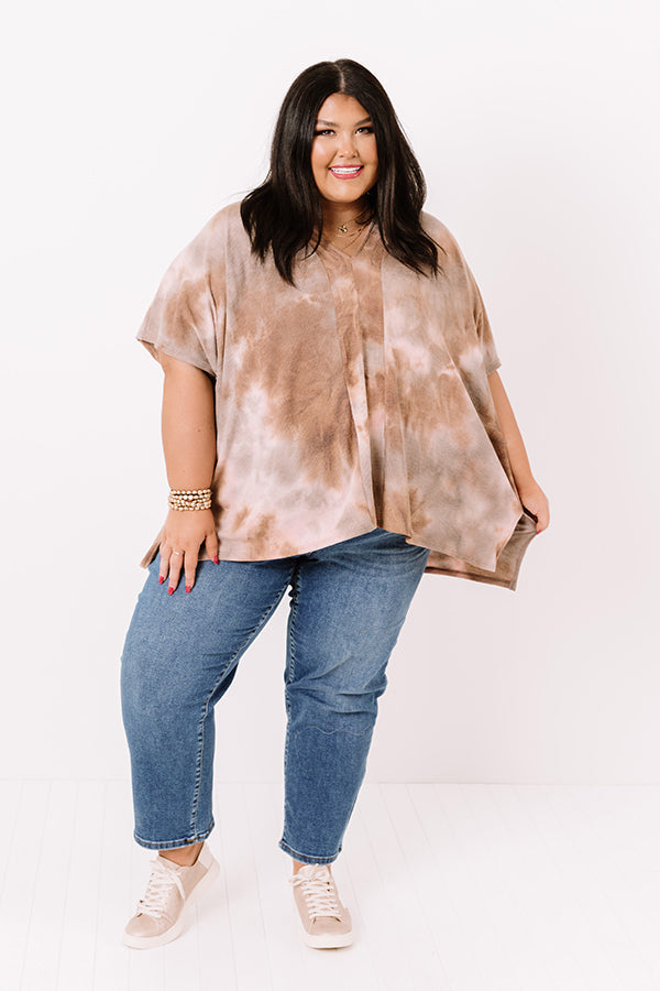 Plus Size - Achieve effortless style with our trendy 'Seconds Until Sundown' shift top featuring soft lightweight flowy material patterned with light brown and pink hued tie dye, a v-cut neckline, short loose sleeves, and a draped silhouette that falls into a straight hemline with accent side slits!