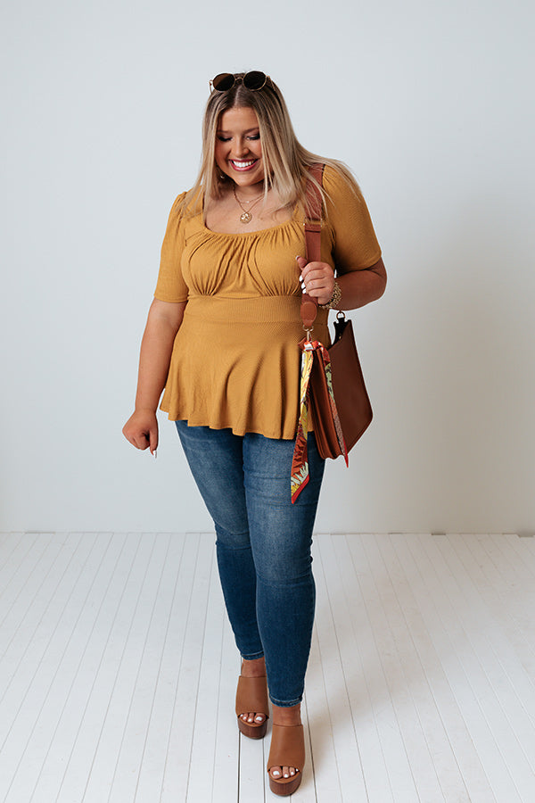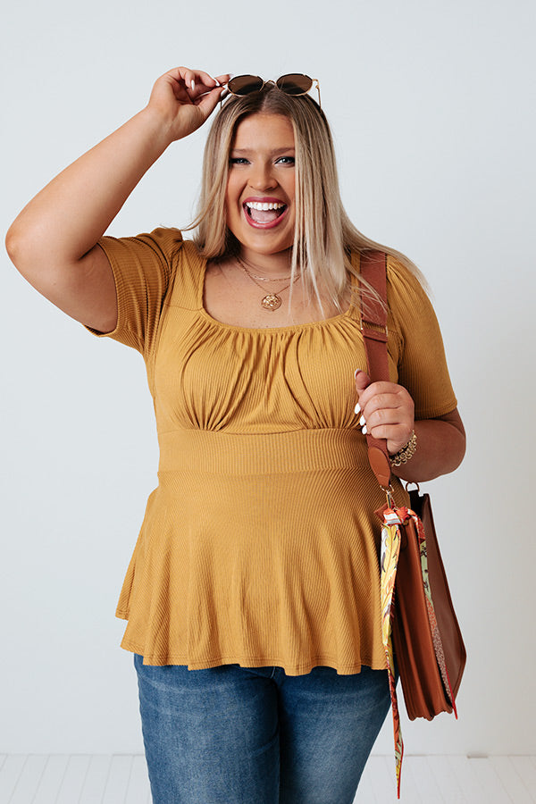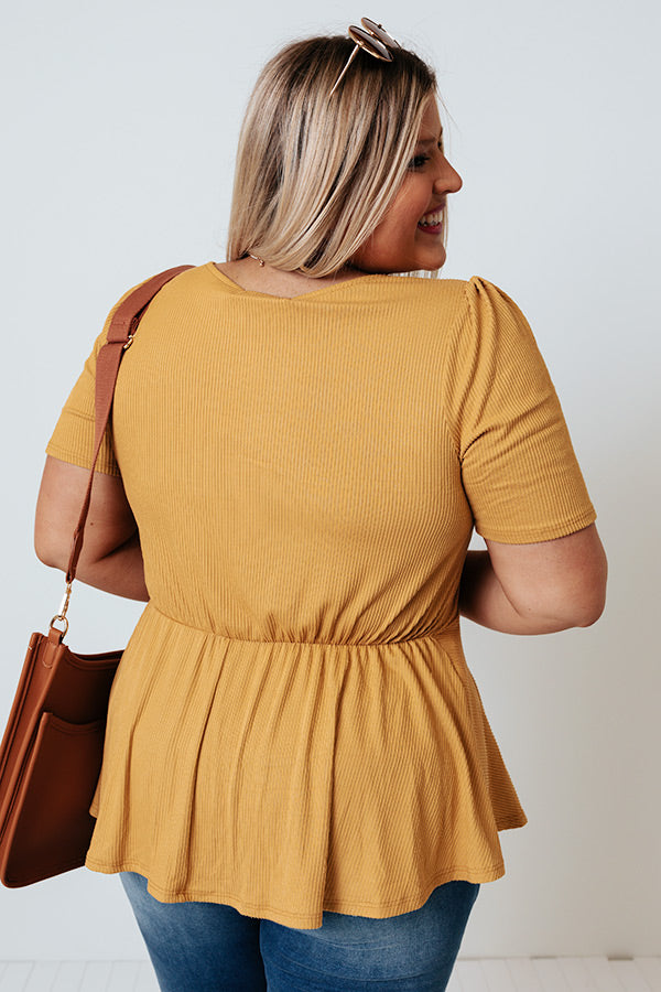 Plus Size - It's no secret we love this darling mustard hued top and we're confident you'll be obsessed with it too! It features lightweight material with subtle ribbed texturing, a flirty bodice with a scooped neckline, fitted half sleeves, and a flattering peplum silhouette with an uneven hemline!