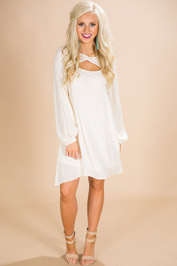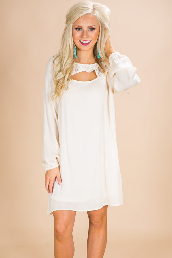 Drop jaws in this sweet shift dress this season! "It's all in the details" definitely holds true with this beauty! Complete with a lace neckline detail with a cutout and a keyhole buttoned back! Measurements