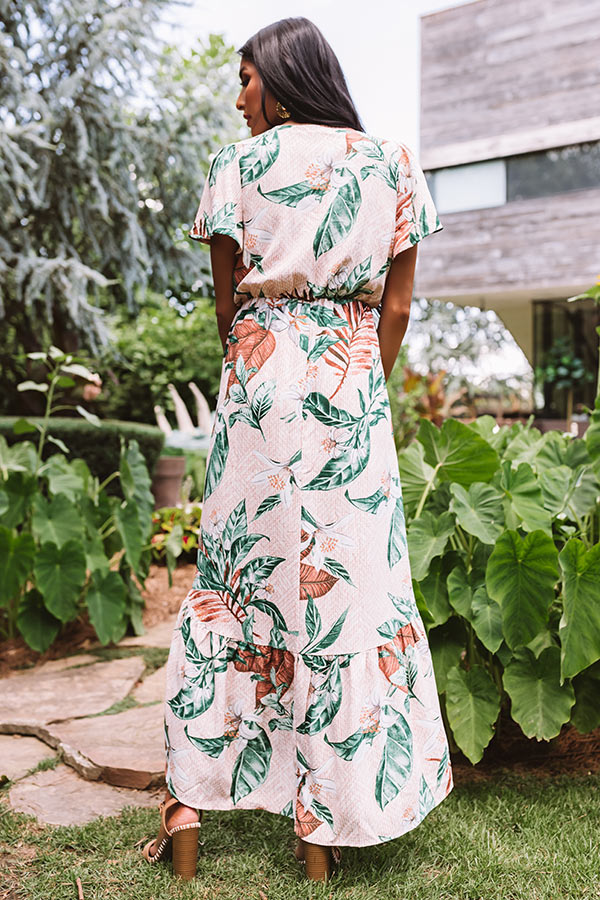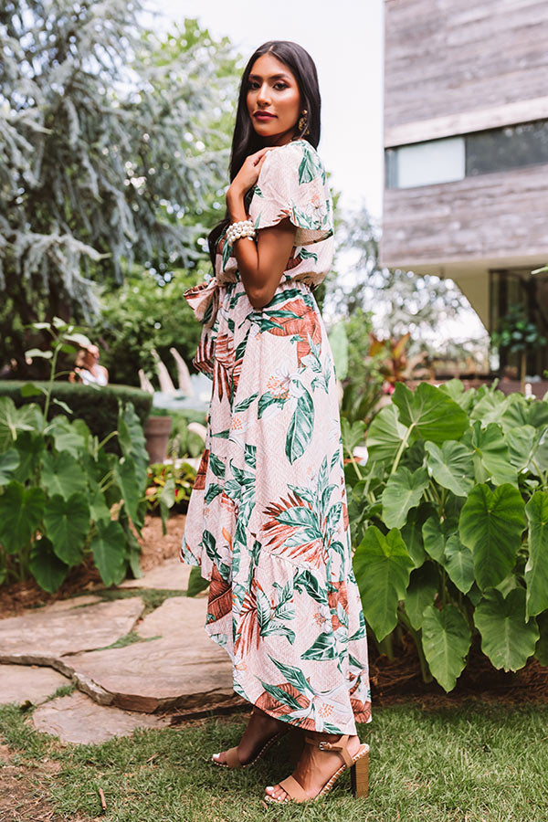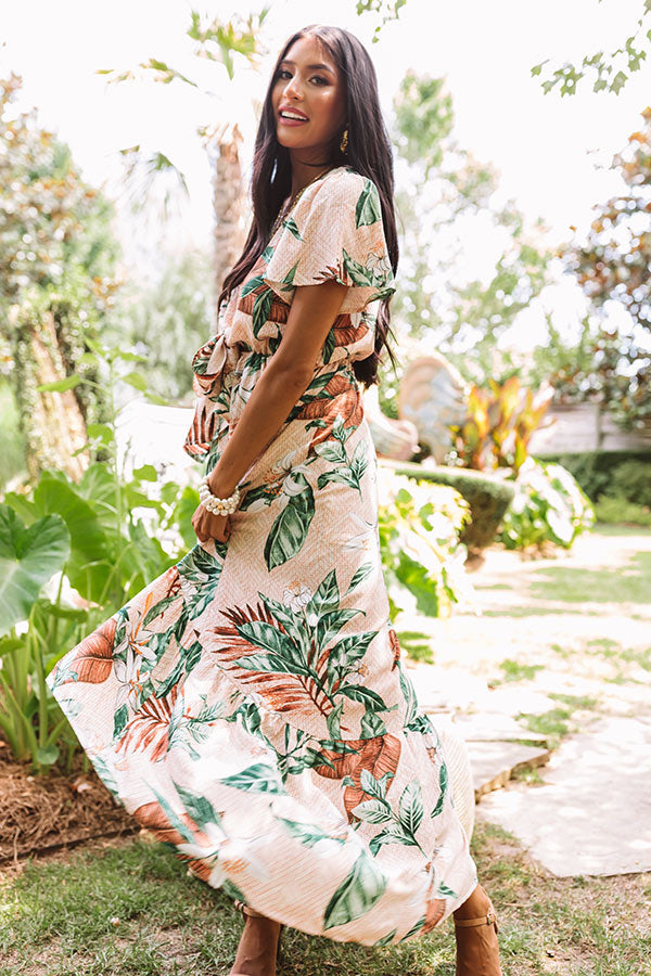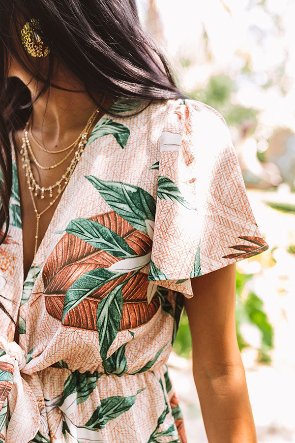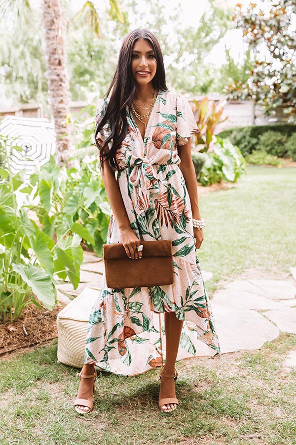 Get vacay ready with our gorgeous "Secret Island" dress featuring lightweight breezy light peach colored material patterned with a an abstract print and a large green, white, and neutral hued floral print, a deep v-cut neckline with a tie closure, a cinched waistline, short draped sleeves, and an ultra relaxed skirt silhouette that falls into an oversized ruffle mid-calf length hemline! We have styled this summer stunner with a brown heel and clutch, but you can also wear it with "The Alba Wedge in Ivory" and our "Laying Out In Laguna Woven Hat!" Measurements