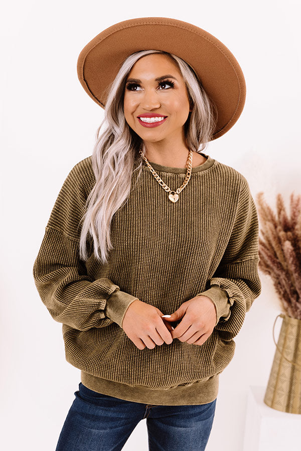 Upgrade your casual wear with our trendy martini olive colored 'Secret Keeper' sweater featuring soft lightweight material with waffle knit texturing, a high rounded neckline, long loose sleeves with fitted cuffs, and a slouched silhouette that ends in a wide straight hemline! Measurements