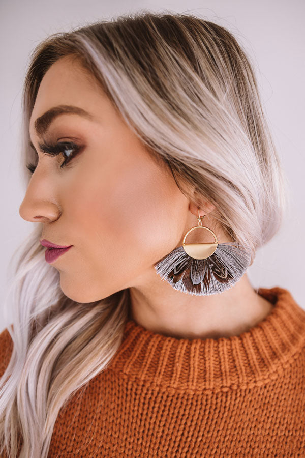 You won't have to wait for a "secret soiree" to accessorize with these adorable statement earrings featuring dangling gold half moons with large grey tassel fans!