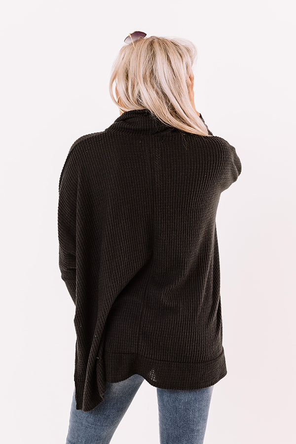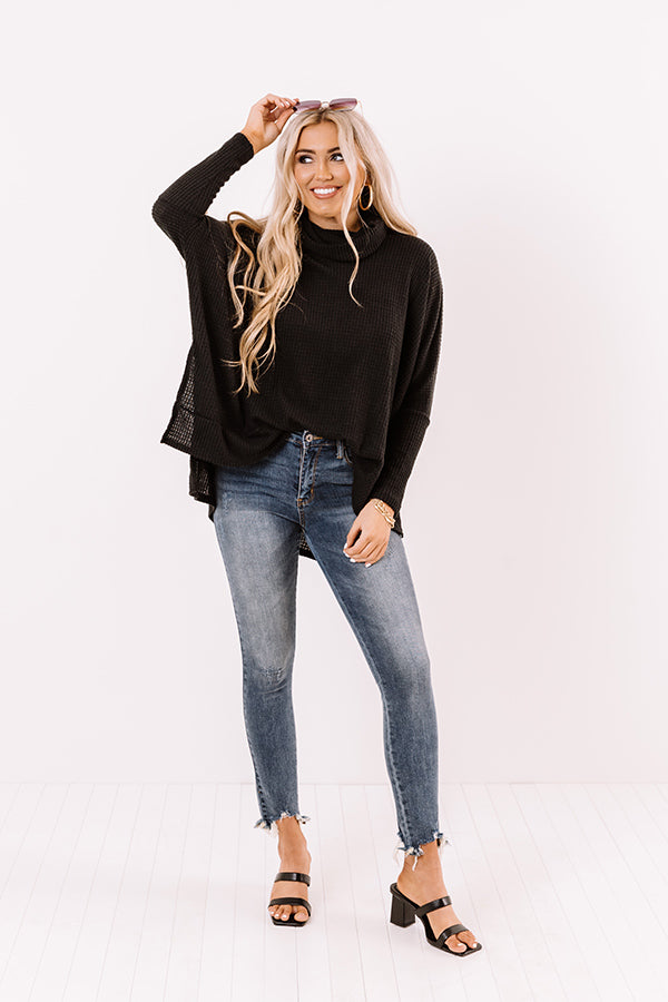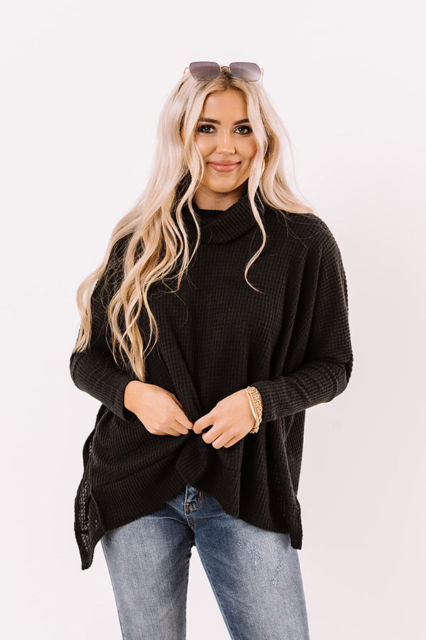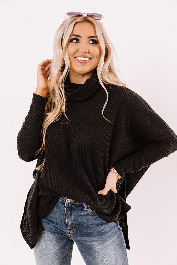 When getting some 'Sedona snuggles,' stay warm and stylish in this black sweater featuring a soft waffle knit texture, a high rounded turtle neckline, long sleeves with fitted forearms, and an ultra relaxed bodice that falls into a straight high/low split hemline!