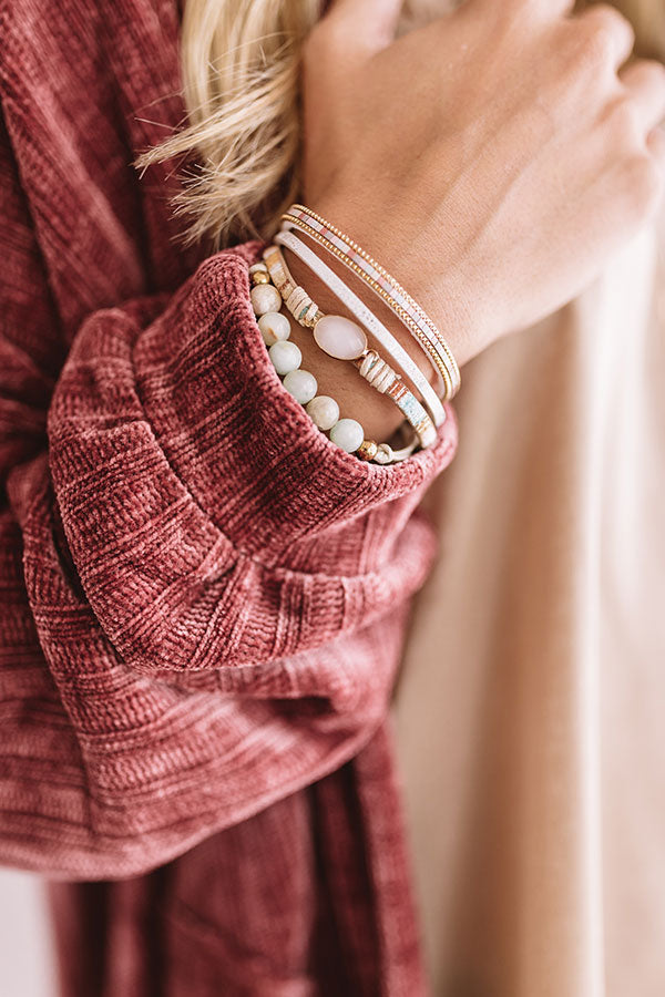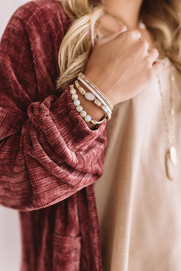 This aqua bracelet is prettier than a "Sedona sunrise" with its four faux leather bands featuring gold and white striped accents, wooden beads, a faux gemstone, and a magnetic closure!