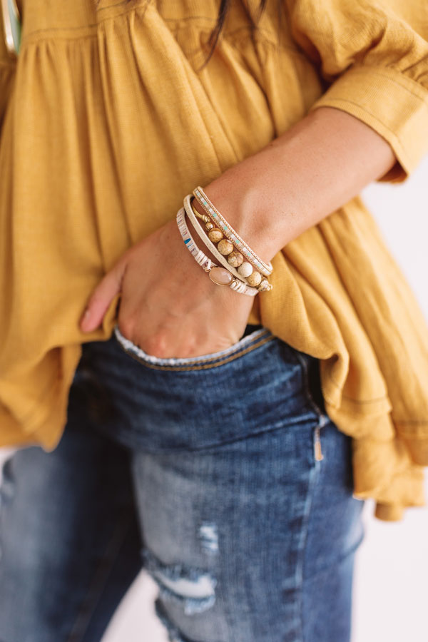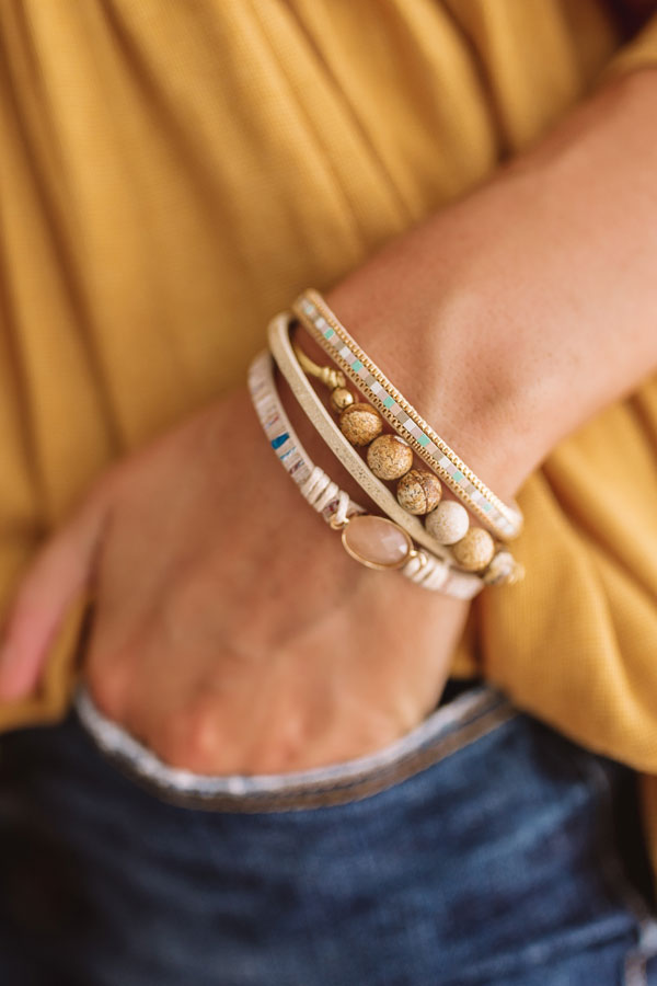 This brown bracelet is prettier than a "Sedona sunrise" with its four faux leather bands featuring gold and blue striped accents, wooden beads, a faux gemstone, and a magnetic closure!