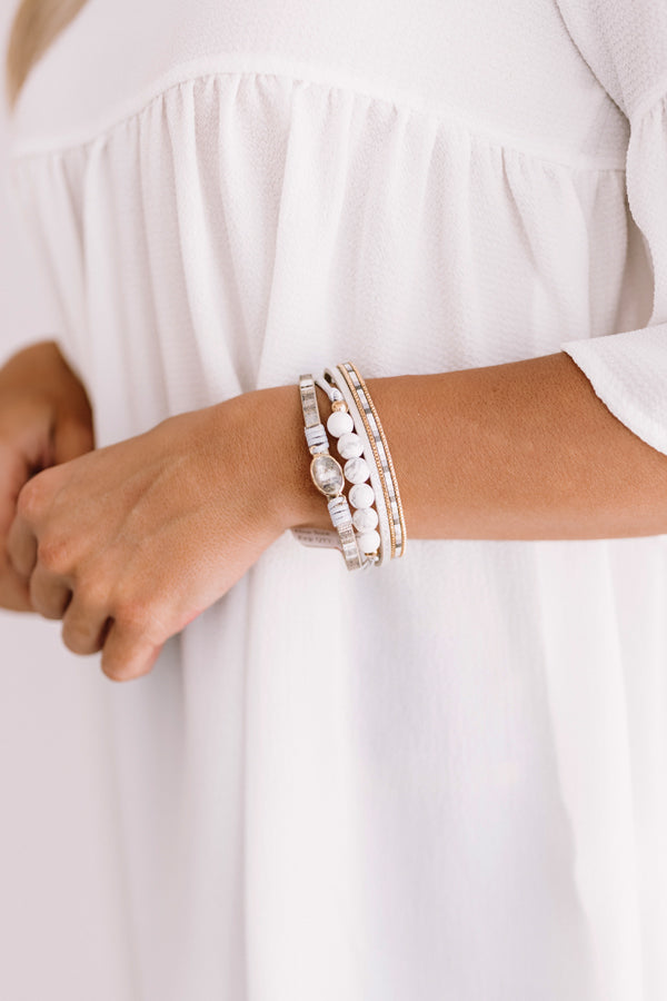 This grey bracelet is prettier than a "Sedona sunrise" with its four faux leather bands featuring gold and white striped accents, wooden beads, a faux gemstone, and a magnetic closure!