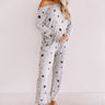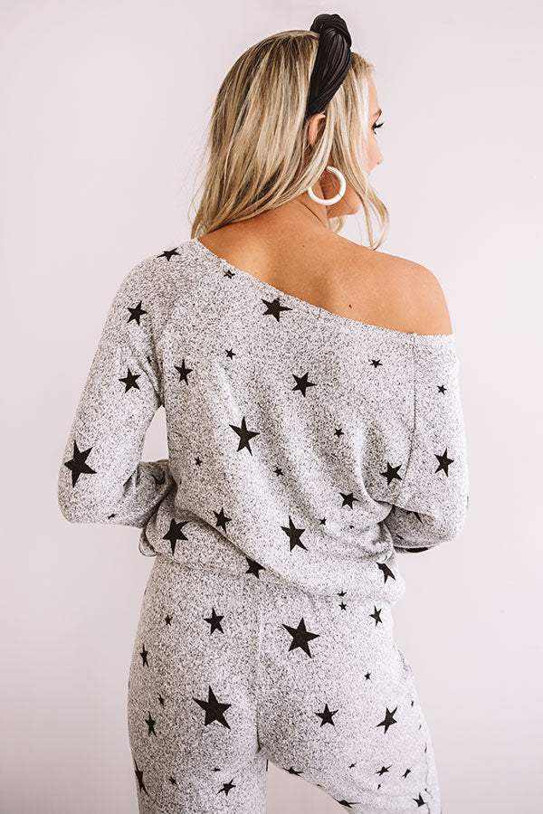 This adorable grey sweatshirt will have you "seeing stars" with its soft lightweight material patterned with black stars, a wide neckline that can be worn off one shoulder, long loose sleeves with more fitted cuffs, and a relaxed silhouette that falls into a straight hemline! All you have to do is style it with our "Seeing Stars Joggers" and add some fuzzy slippers for the ultimate cozy two piece look that will have you shining bright! Measurements