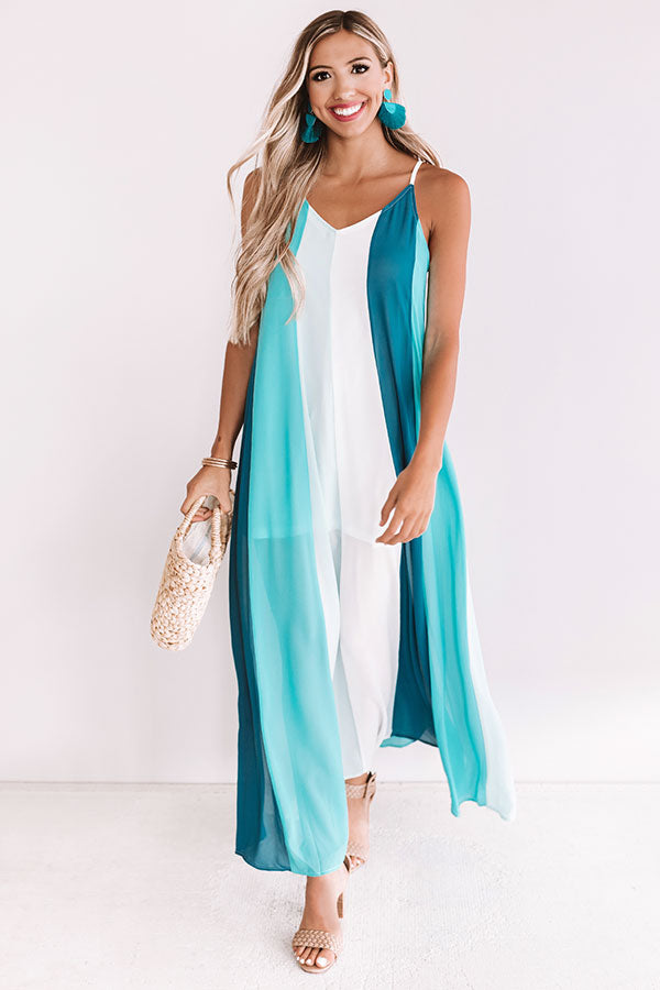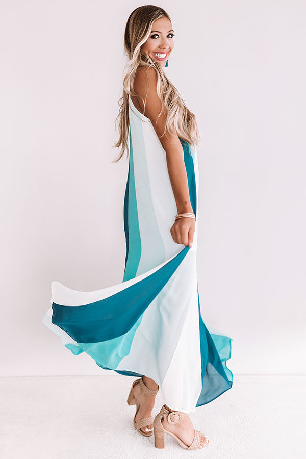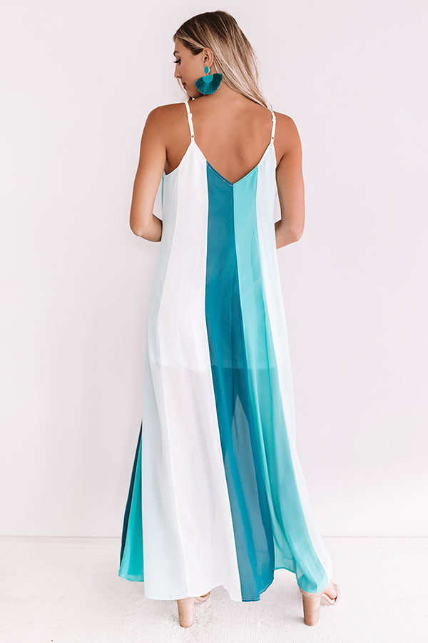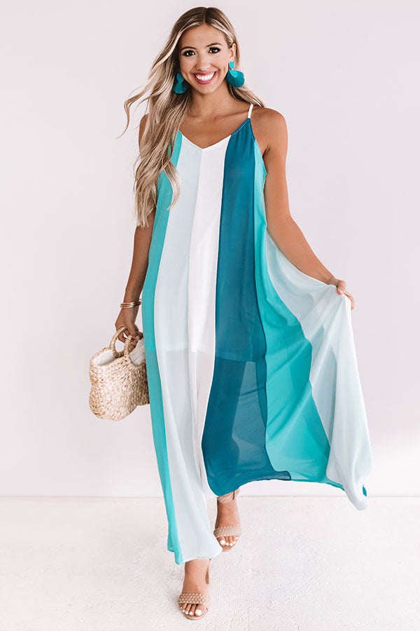 We dream in colors borrowed from the sea, that's why we are in LOVE with this turquoise maxi with its blue hued stripes, adjustable spaghetti straps, and v-neck front and back! Plus, it has a thigh length white slip for more coverage. This azure beauty pairs stunningly with our "Santa Monica Pier Strollin' Espadrille in White" and "Right On Cue Fringe Clutch in White" for the ultimate shoreline style! Measurements