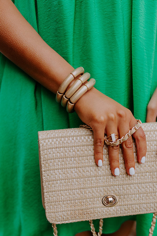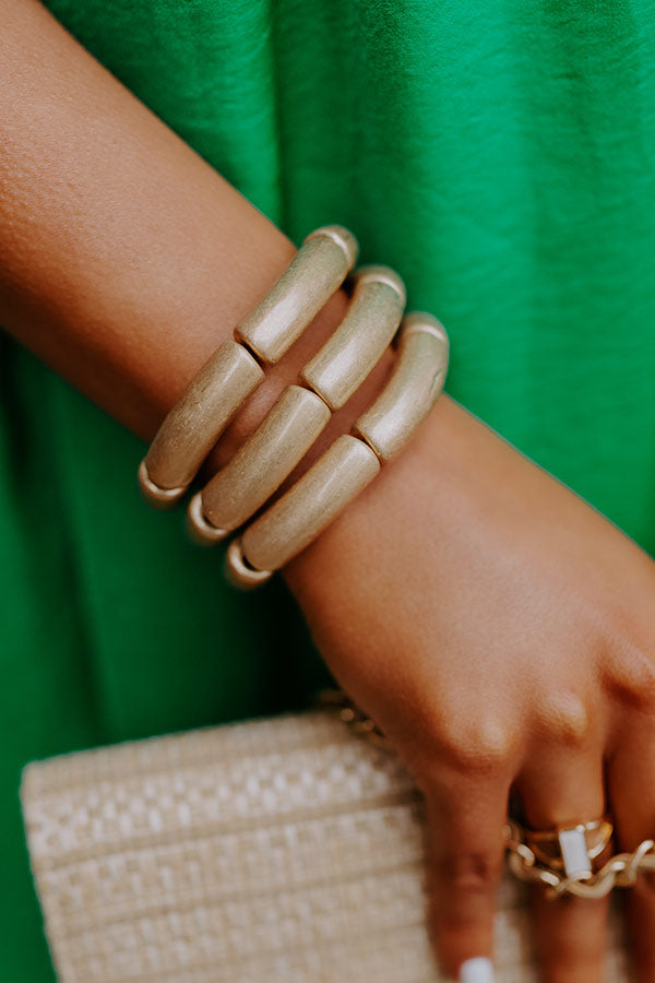 Upgrade your look by accessorizing with our chic 'Send My Love To Paris Bracelet' featuring a neutral and gold cylindrical piece stretch band!