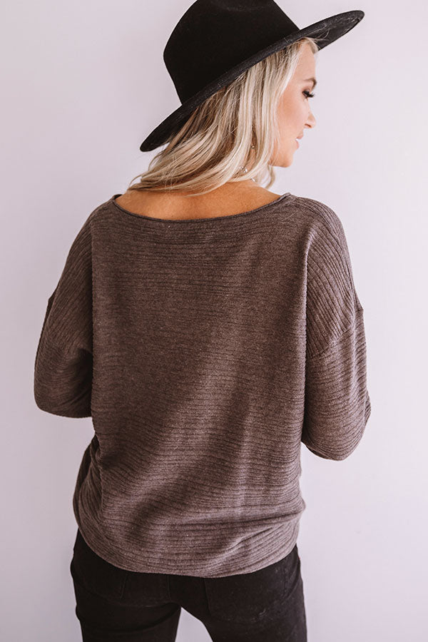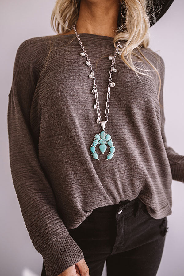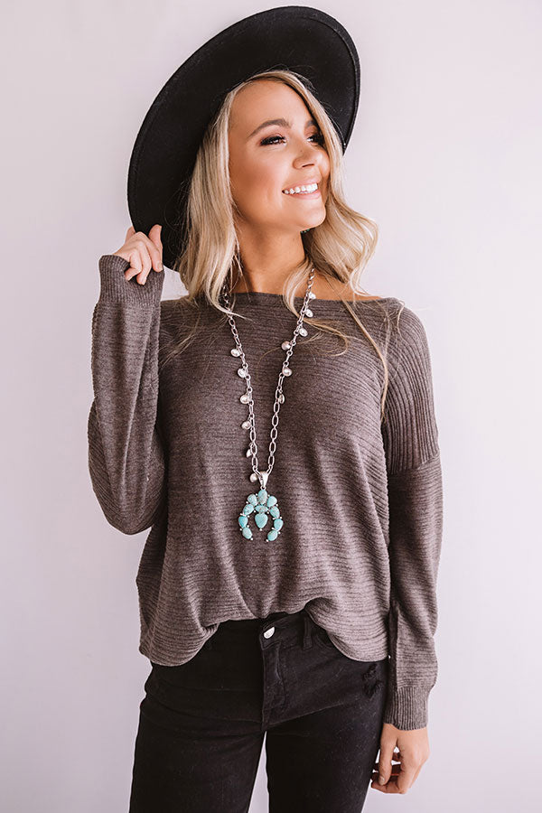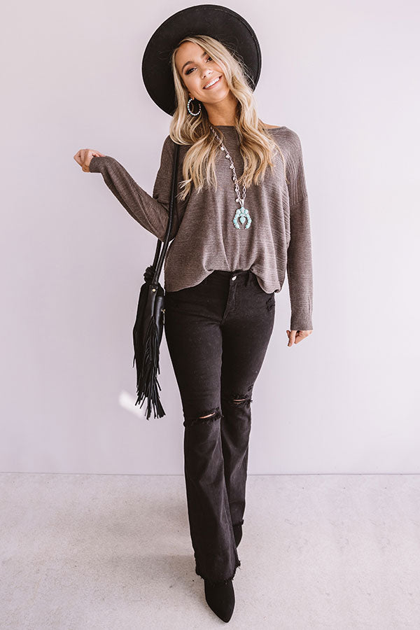 Our hazelnut colored "Send My Regards Shift Top" is the perfect lightweight top for any season with its soft tight knit material, wide rounded neckline that can be worn off one shoulder, long loose sleeves with fitted cuffs, and a relaxed silhouette that falls into a straight hemline! We have styled this casual cutie with some flares, turquoise statement jewelry, and a black bootie, fringe crossbody, and faux suede hat, but you can also wear it with some frayed light wash skinnies and "The Seraphina Faux Leather Wedge in Brown!" Measurements