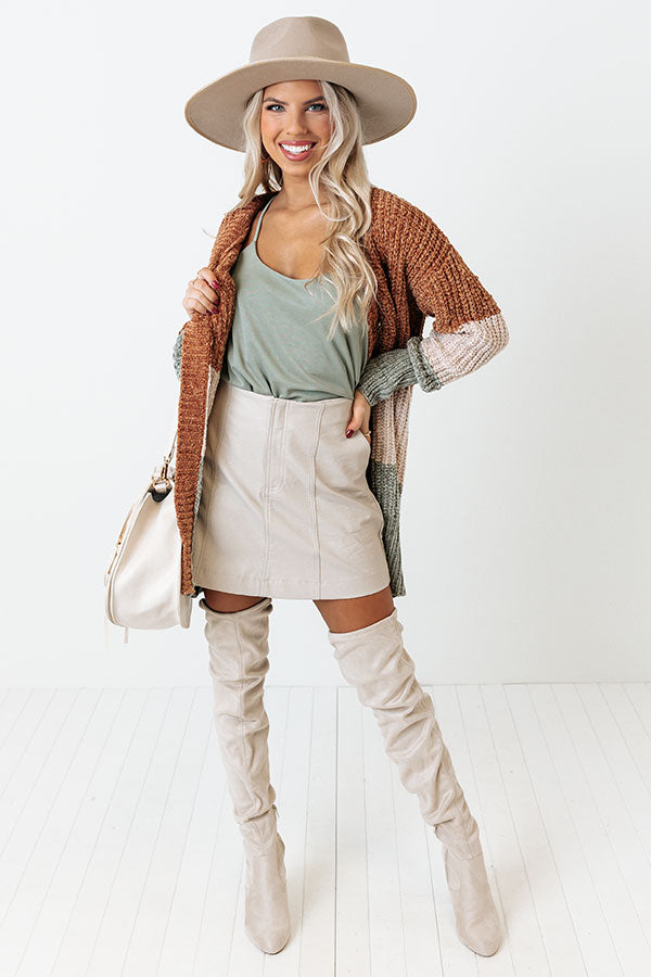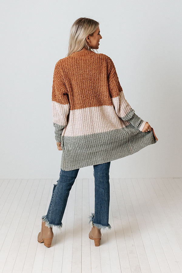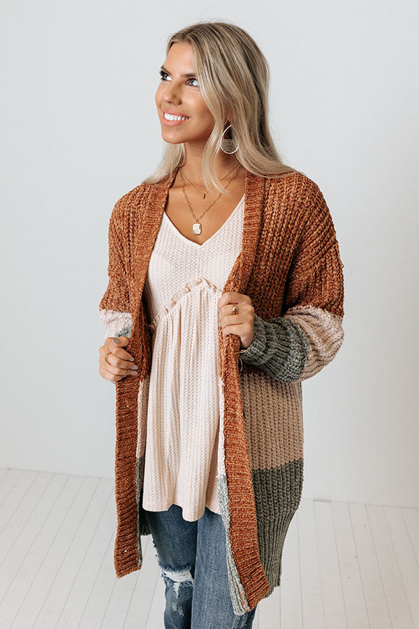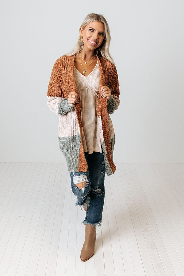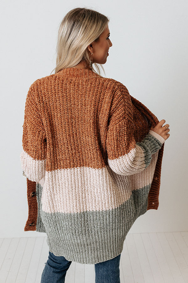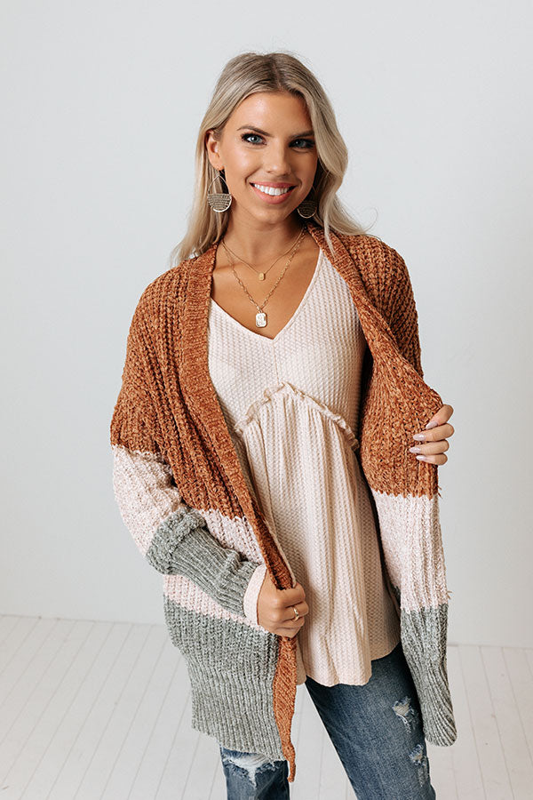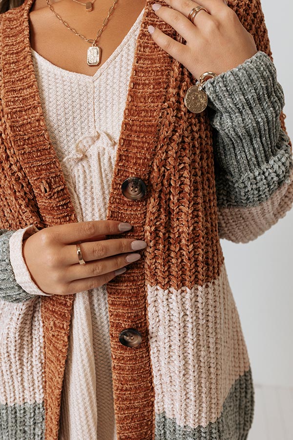 The perfect fall piece just dropped! Our charming 'Senora Sunrise' cardigan features soft and warm chenille material with camel, cream, and sage hued color block panels, long loose sleeves with fitted forearm cuffs, a button down front with a v-cut neckline, and a draped silhouette that falls into a straight mid-thigh length hemline!
