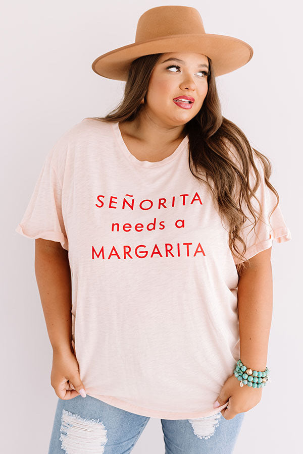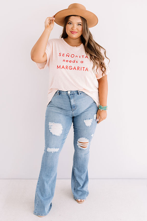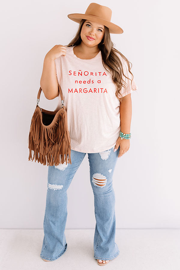 Plus Size - Get ready to make a statement at happy hour with our adorable "Senorita Needs A Margarita" shift tee featuring soft lightweight material with large red lettering on the front, a high rounded neckline, short loose sleeves, and a relaxed silhouette that falls into a straight hemline with side slits! We have styled this trendy piece with some distressed light wash flares and a brown heel, fringe tote, and wool hat, but you can also wear it with our "On The Radio Leopard Skirt," our red "Hadid Faux Suede Bootie," and our "Pretty Style Quilted Tote in Red!"