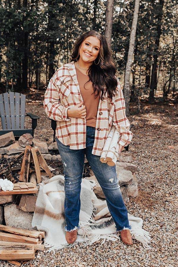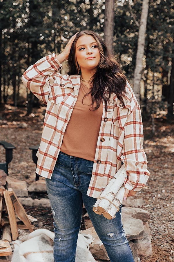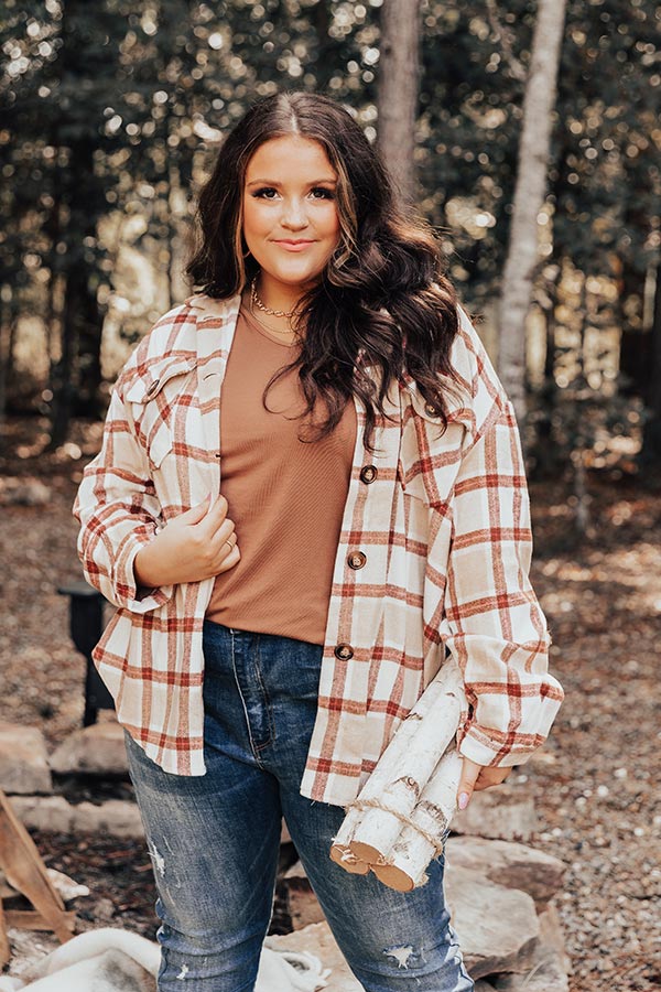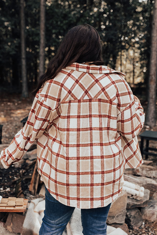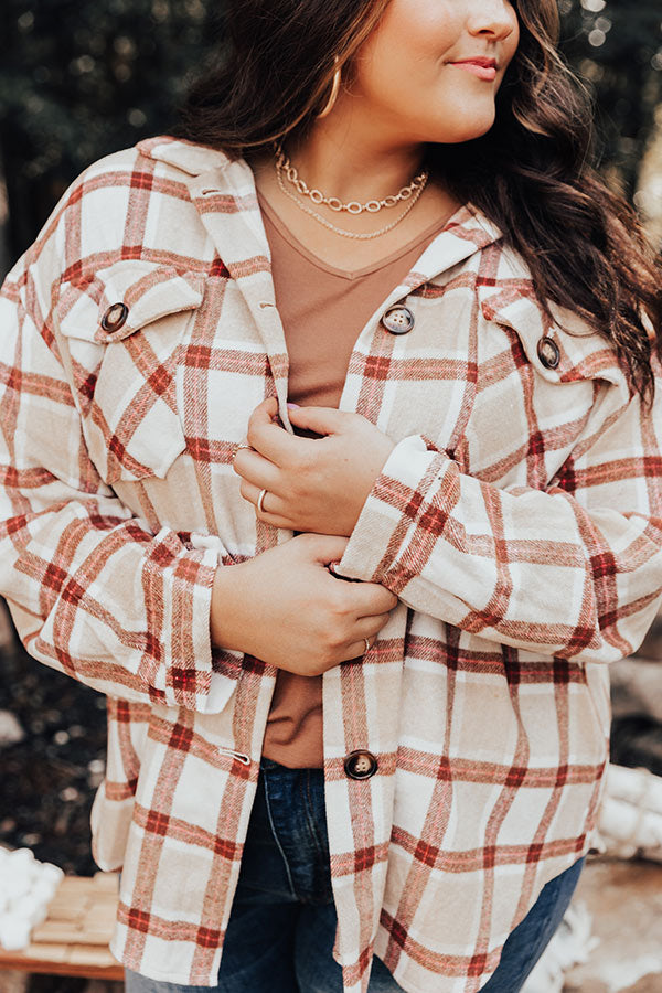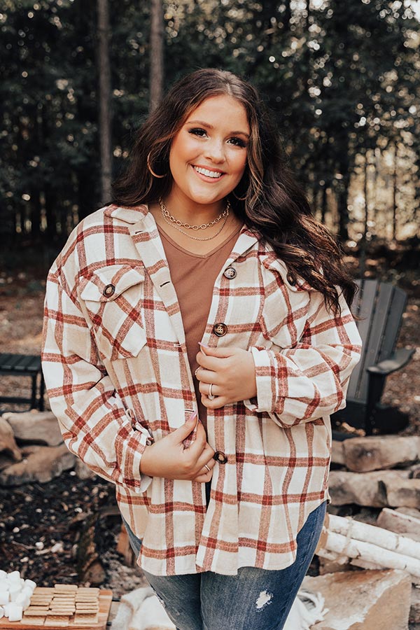 Layer up like a true fashionista this fall with our trendy white 'September Sunsets' jacket featuring warm material patterned with a dark red hued plaid print, a button down front with a collared neckline, long loose sleeves with button closure cuffs, two accent chest pockets with flap closures, and a relaxed silhouette that falls into a rounded hemline! Measurements