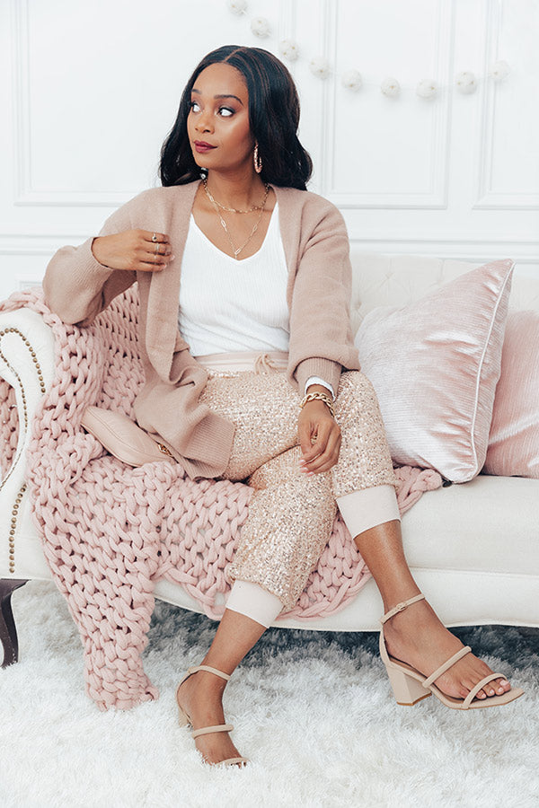 You are sure to be all smiles when you wear these eye-catching champagne colored joggers featuring lightweight material covered in shimmering sequins, a wide elastic waistline with a tie belt closure, accent side pockets, and a slouched pants silhouette that tapers into fitted ankle-length hemlines! Measurements