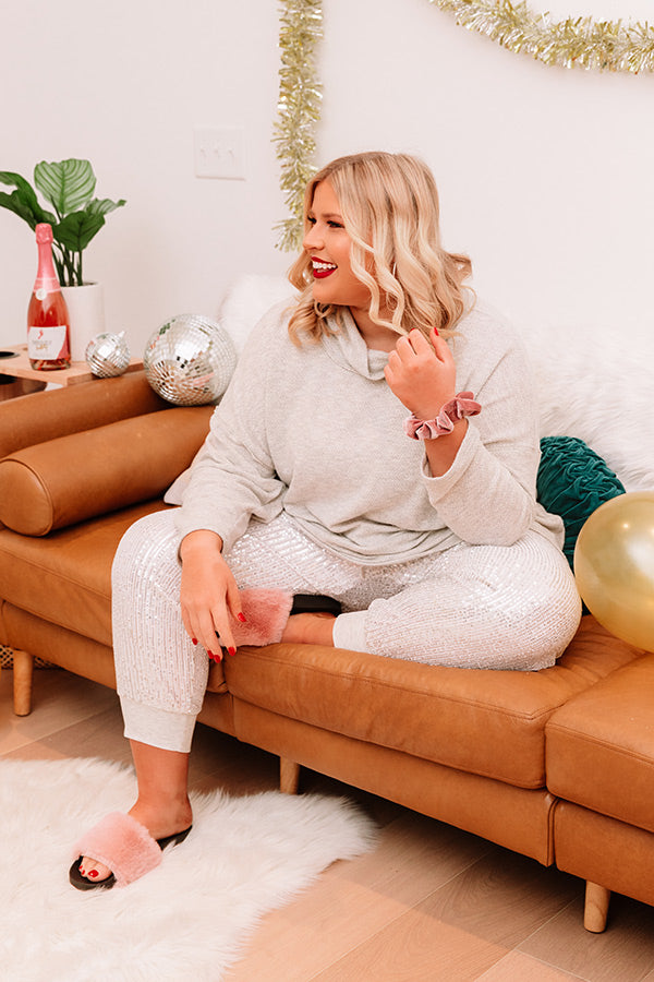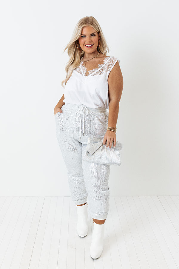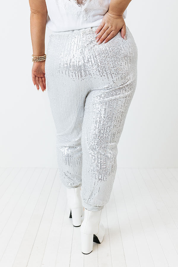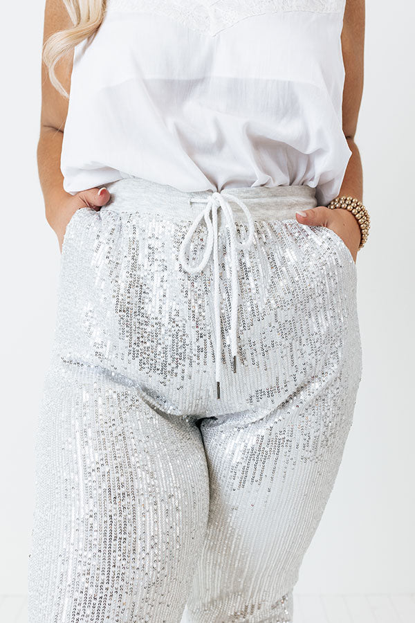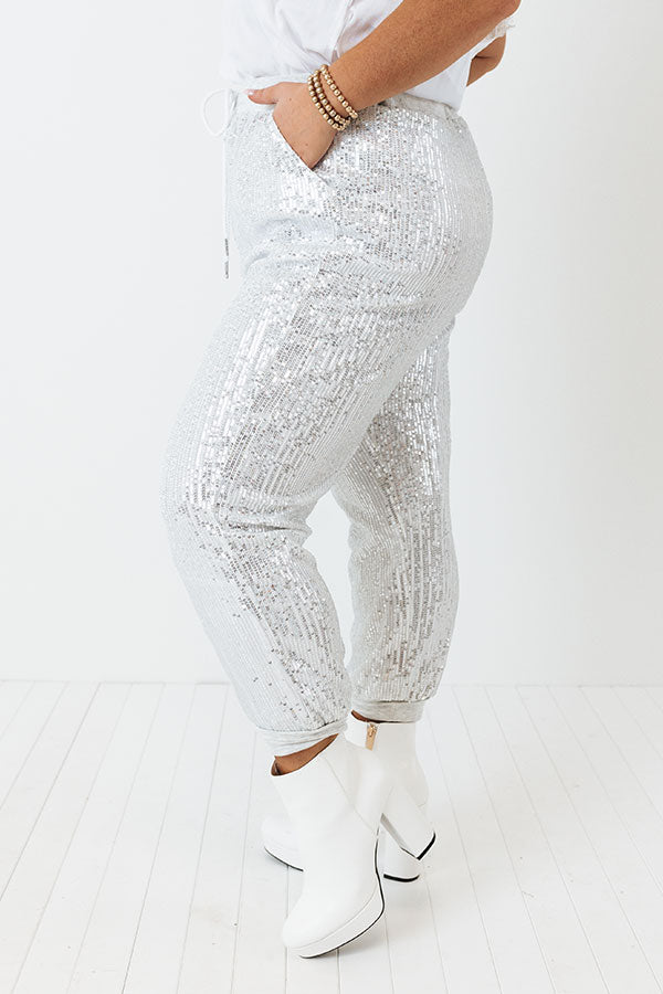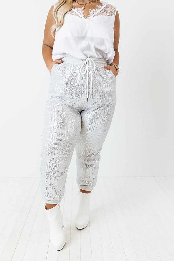 Plus Size - You are sure to be all smiles when you wear these eye-catching silver joggers featuring lightweight material covered in shimmering sequins, a wide elastic waistline with a tie belt closure, accent side pockets, and a slouched pants silhouette that tapers into fitted ankle-length hemlines! Measurements