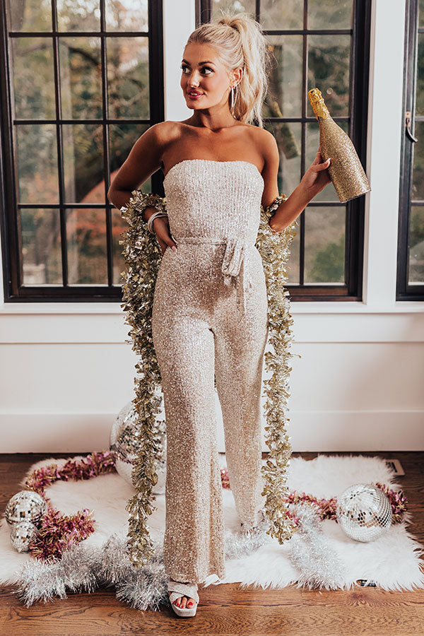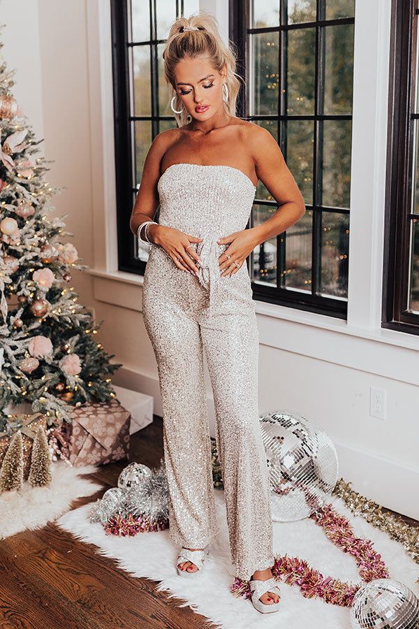 Shine bright in our stunning 'Sequins On The Rocks Jumpsuit' featuring shimmering silver sequins throughout, a straight strapless neckline, a tie belt, a zip closure back, and a relaxed pants silhouette that falls straight into ankle-length hemlines! Measurements