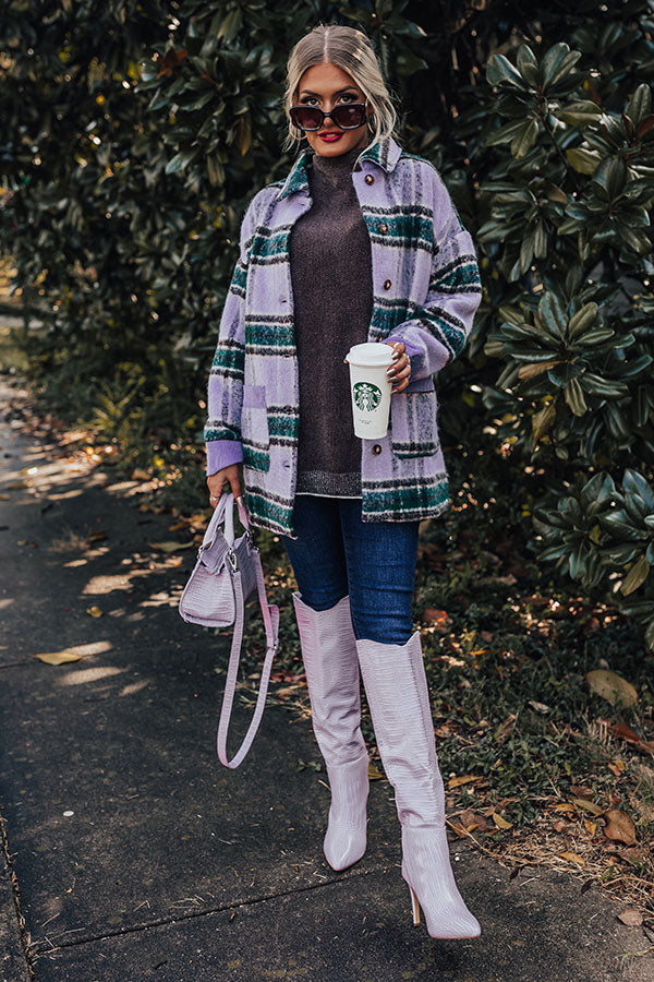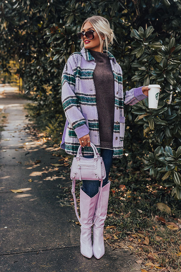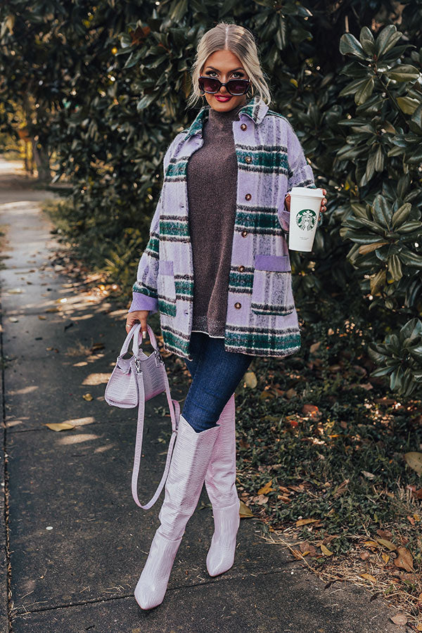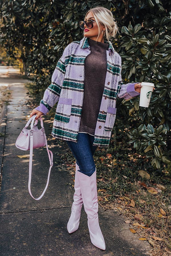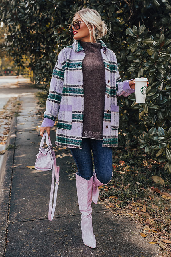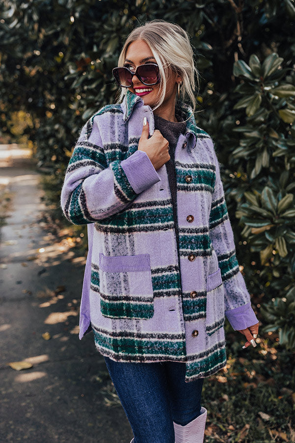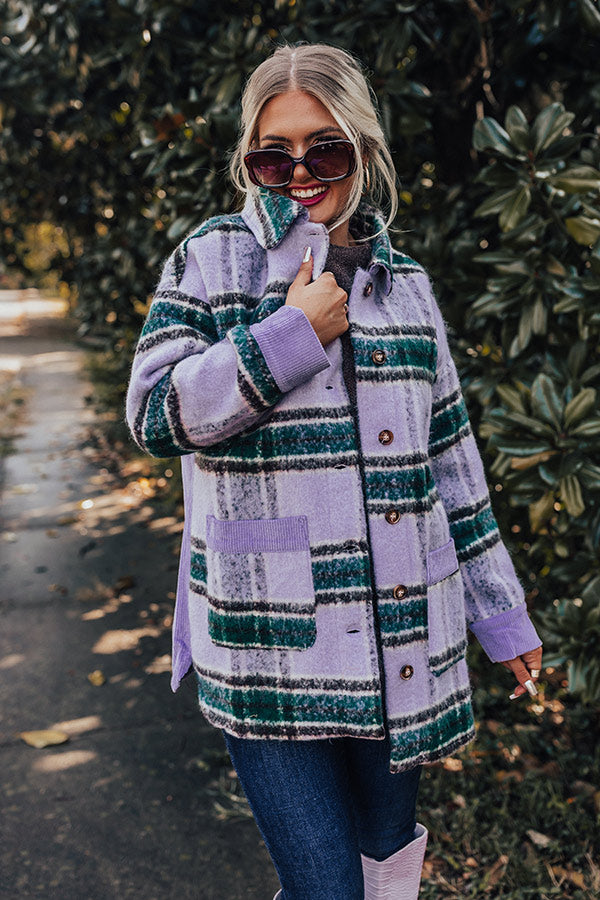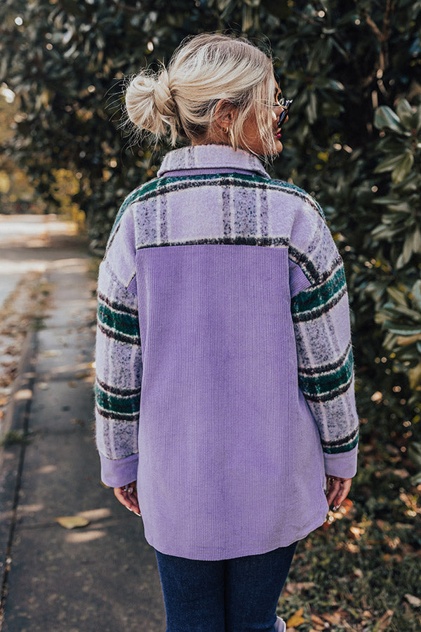 Stay warm and cozy in our beautiful 'Sequoia Snuggles' jacket! Features warm lavender material with a green and brown hued plaid design, a corduroy back, a corduroy collared neckline that goes into a button down front, long sleeves with corduroy cuffs, low pockets with corduroy accents, and a relaxed silhouette that end in a straight mid-thigh length hemline.