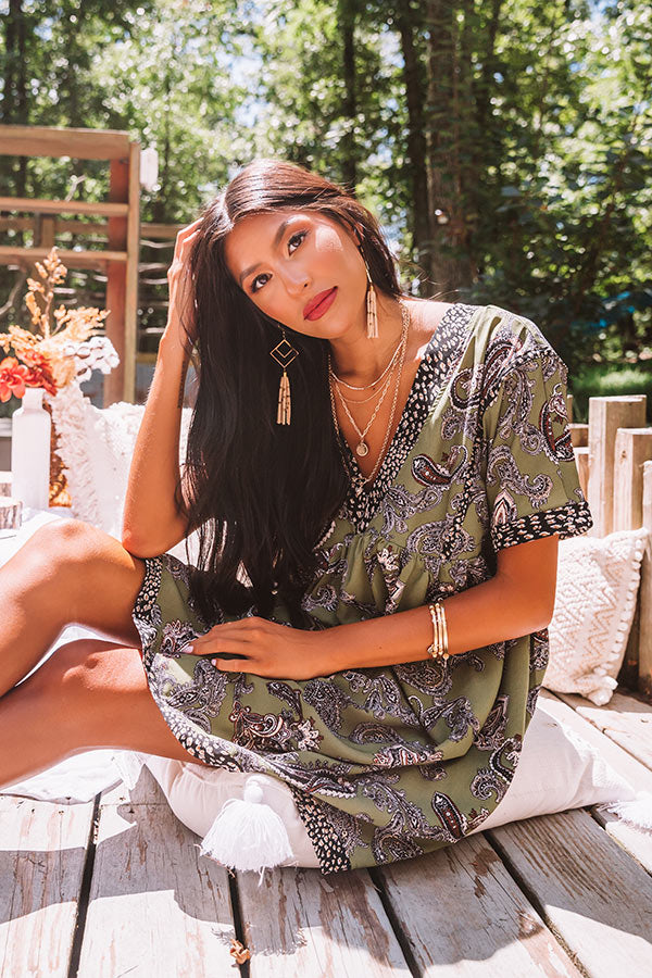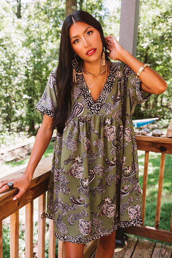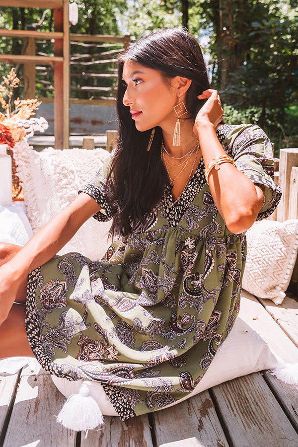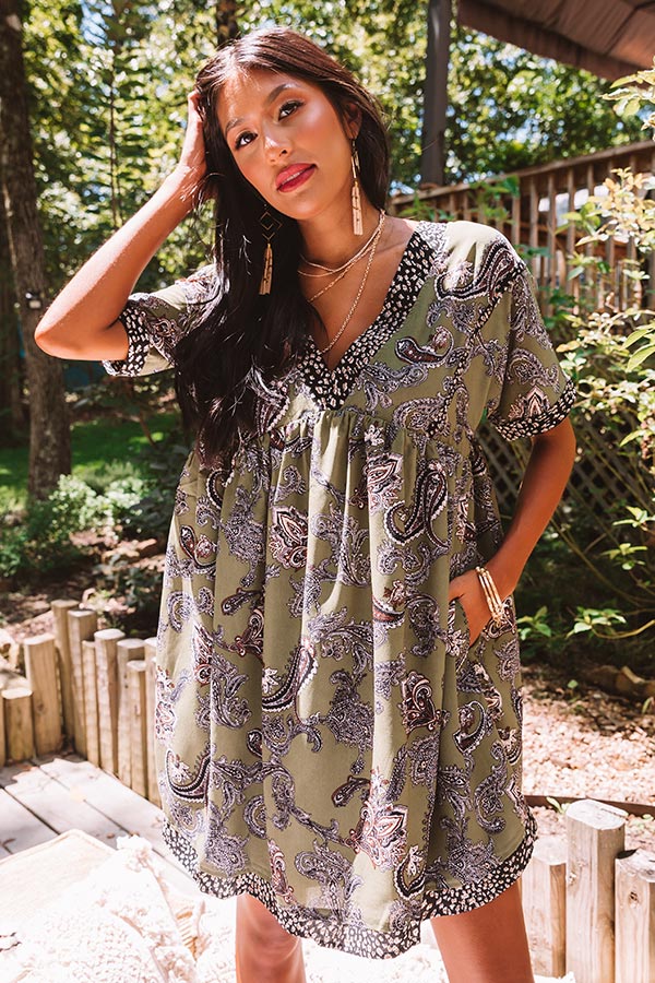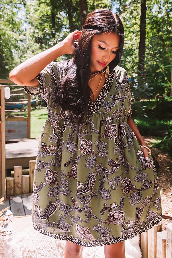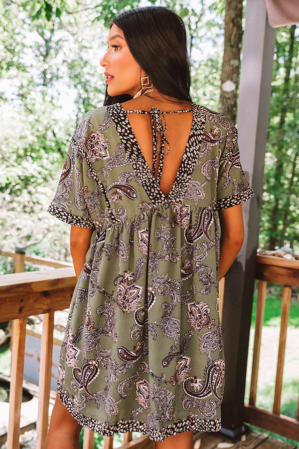 Welcome fall in style with our adorable serene olive colored dress featuring lightweight breezy material with a large black and white paisley print, wide patterned accent trim, a deep v-cut neckline and upper back with a tie closure, short loose sleeves, and an ultra relaxed babydoll silhouette that falls into an uneven mid-thigh length hemline! This unique piece styles perfectly layered under a jean jacket with our "Go On Faux Suede Heel in Black," our "Chic Harmony Fringe Tote in Black," and our "Merlot Nights Hat in Black!" Measurements