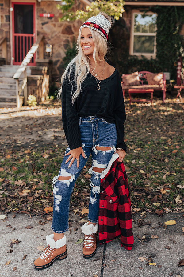 We are serious about how much you are going to LOVE this versatile black top featuring lightweight material with waffle knit texturing, long loose sleeves, a v-cut neckline that can be worn off one shoulder, and a relaxed silhouette that falls into a straight cropped hemline! Measurements