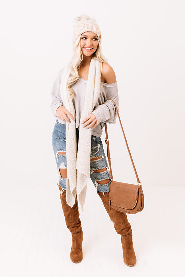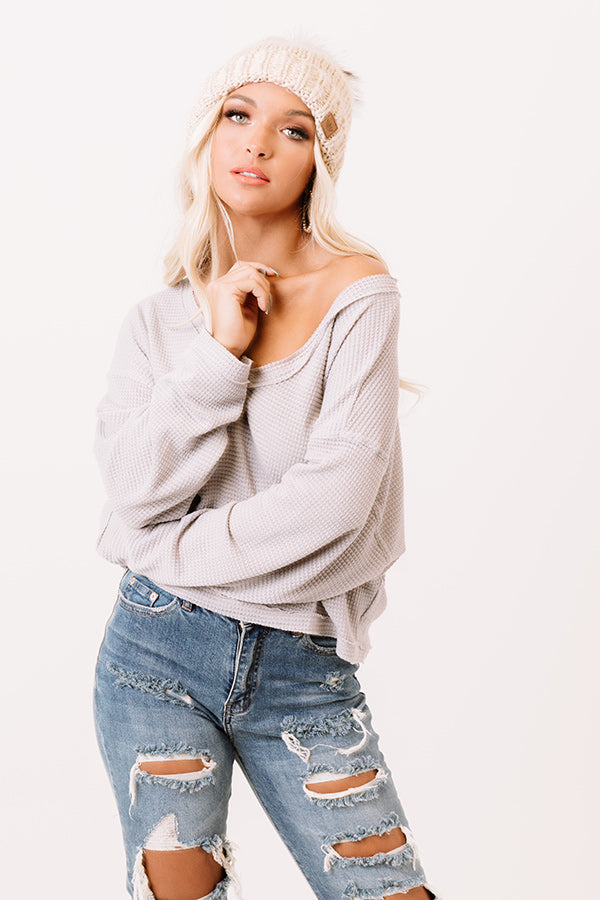 We are serious about how much you are going to LOVE this versatile light grey top featuring lightweight material with waffle knit texturing, long loose sleeves, a v-cut neckline that can be worn off one shoulder, and a relaxed silhouette that falls into a straight cropped hemline!