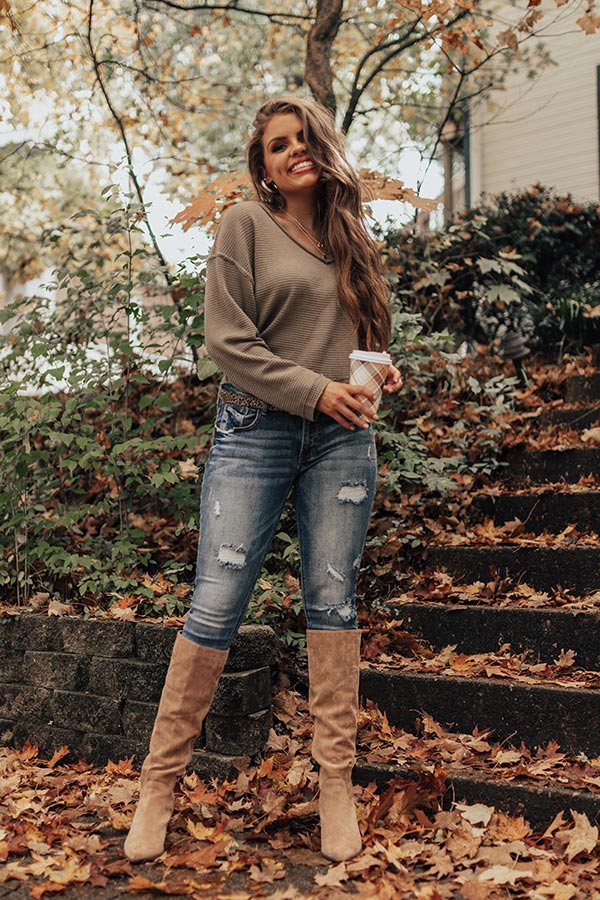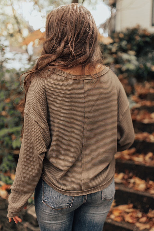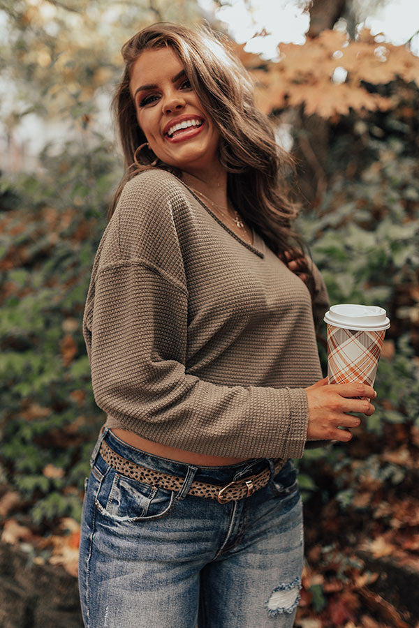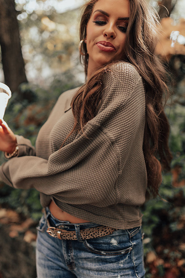 We are serious about how much you are going to LOVE this versatile sage colored top featuring lightweight material with waffle knit texturing, long loose sleeves, a v-cut neckline that can be worn off one shoulder, and a relaxed silhouette that falls into a straight cropped hemline!