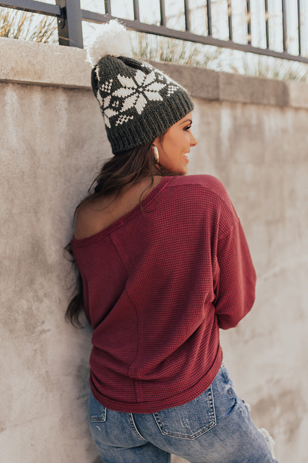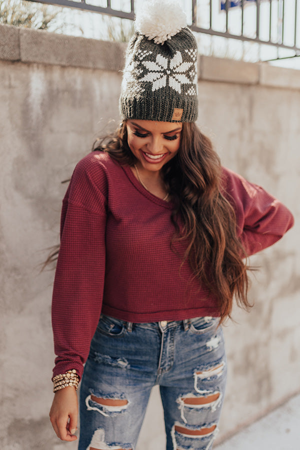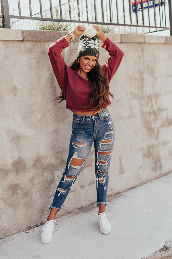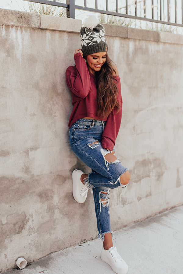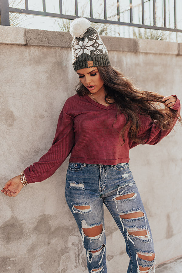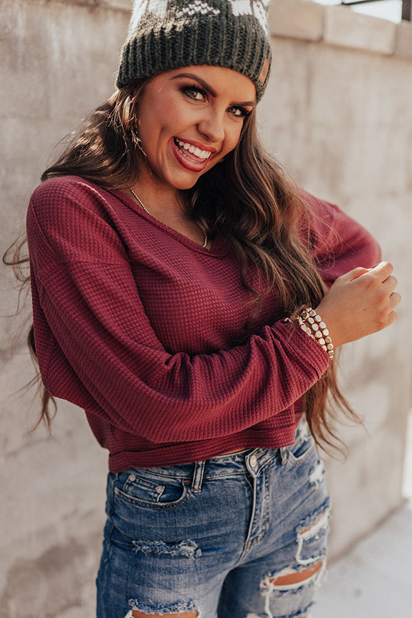 We are serious about how much you are going to LOVE this versatile wine colored top featuring lightweight material with waffle knit texturing, long loose sleeves, a v-cut neckline that can be worn off one shoulder, and a relaxed silhouette that falls into a straight cropped hemline!