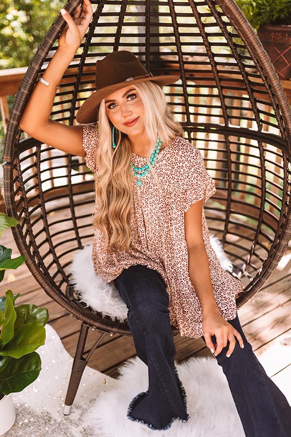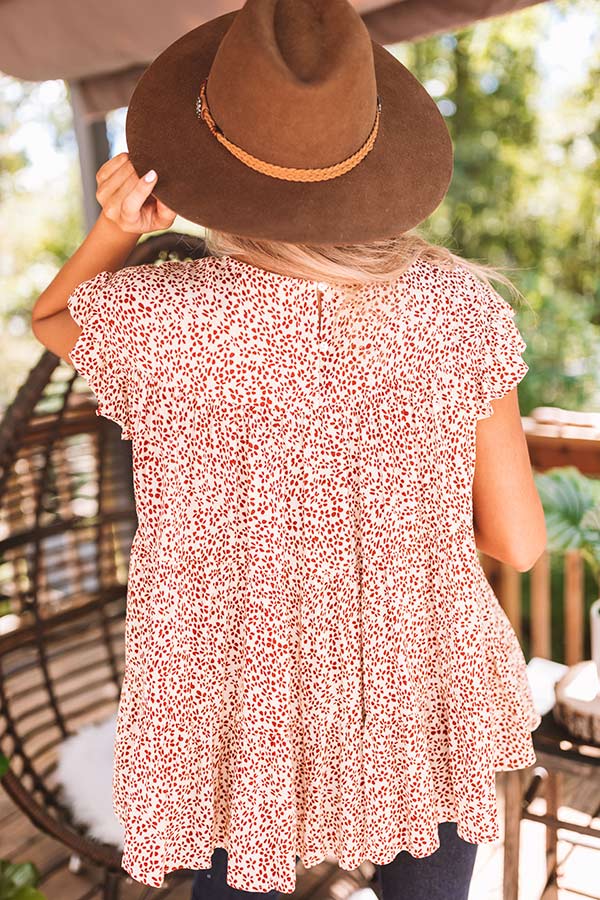 Transition to fall effortlessly with our adorable cream colored "Serious Delight" top featuring lightweight material patterned with a small brown/dark red floral print, a high rounded neckline, short loose sleeves with ruffled trim detailing, a keyhole accented upper back with a button closure, and a relaxed tiered babydoll silhouette that falls into an uneven hemline! We have styled this fall cutie with some dark wash flares and a brown mule heel and wool hat, but you can also wear it with some frayed white shorts, "The Corey Faux Suede Bootie in Brown," and our "Chic Harmony Fringe Tote in Brown!" Measurements