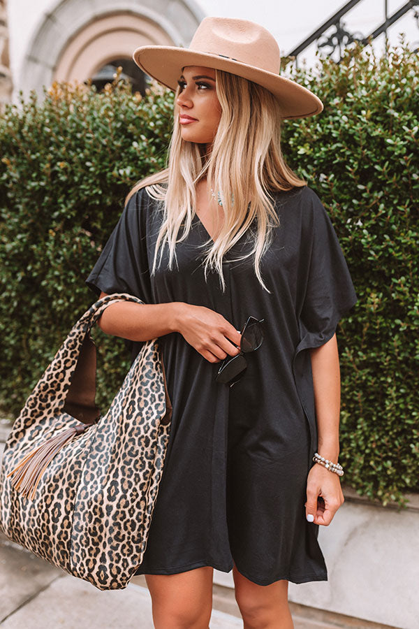 This tan colored tote is guaranteed to be a "serious showstopper" with its bold black leopard print, faux leather material, two handles, large accent tassels, and slouched spacious square pouch with a zip up closure and additional inside pockets!