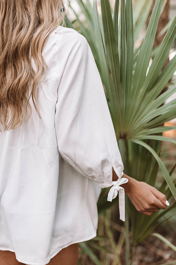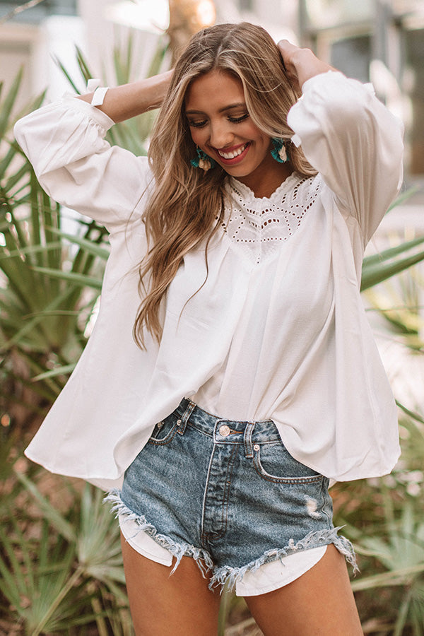 Everyone will be "seriously crushing" on you when you take on your day in style with this classic white top featuring a gorgeous eyelet pierced v-neckline, quarter length sleeves that tie at the cuff, and a breezy polyester bodice! We have styled this transitional piece with frayed denim shorts, neutral wedges, and turquoise earrings for beautiful summer look, but for a more cold weather look, you can pair this blouse with our "Beckett High Waist Leopard Pants" and "The Stella Perforated Bootie in Chocolate!"