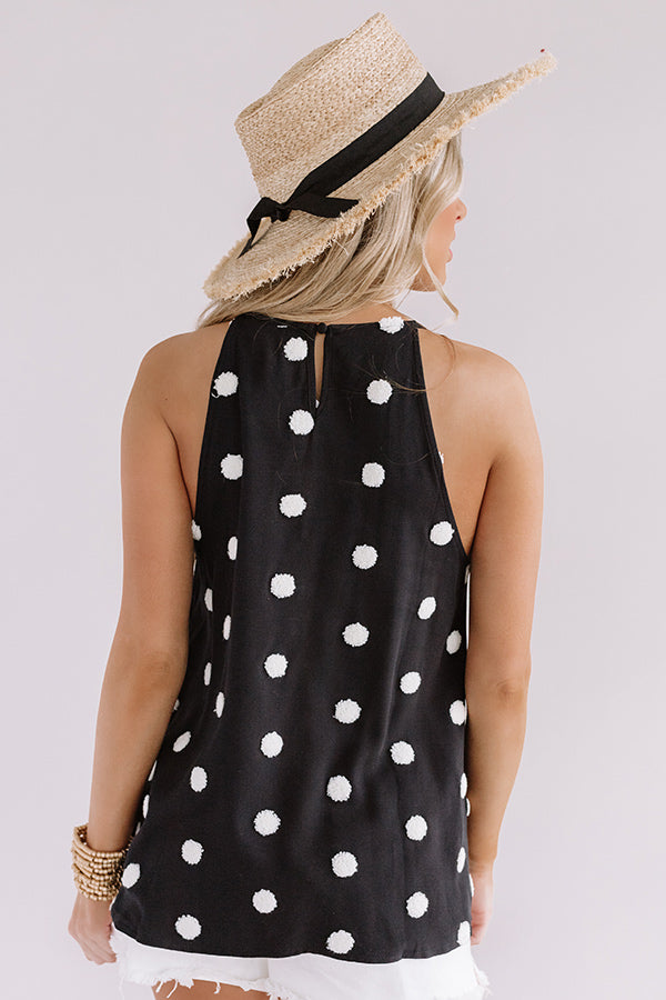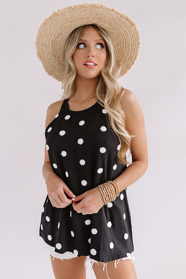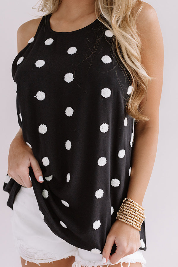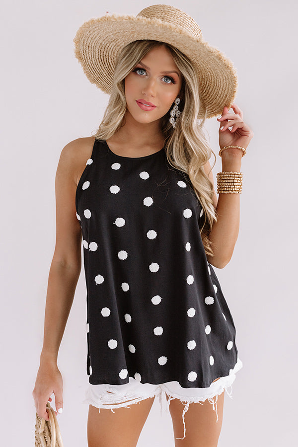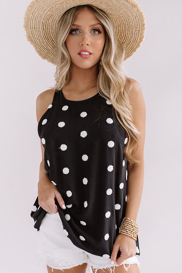 Keep your OOTD simple with our charming black "Seriously Outgoing" tank featuring soft lightweight material patterned with a textured white polka dot print, a high rounded neckline, 1-inch shoulder straps, and an ultra relaxed silhouette that falls into a rounded hemline! You can style this cutie a variety of ways, like with some distressed white shorts, statement earrings, black wedges, and a woven hat and tote, but you can also wear it layered under a denim jacket with some white flares and "The Carolina Heel in Black!" Measurements