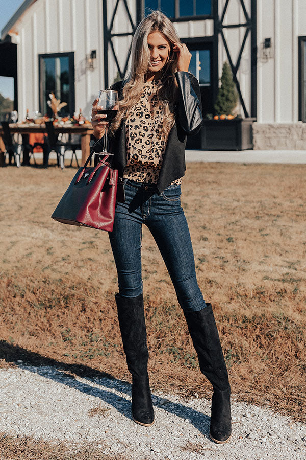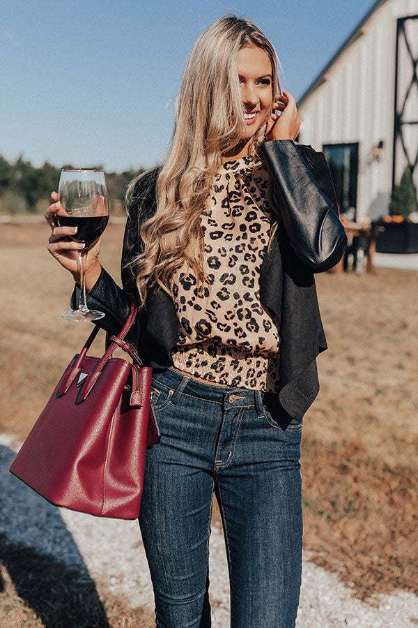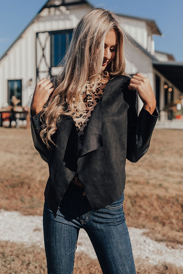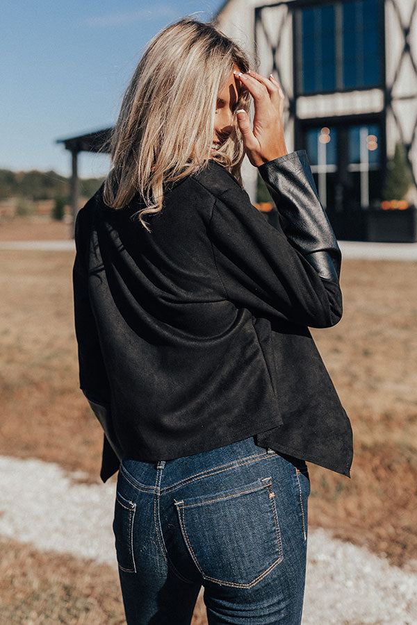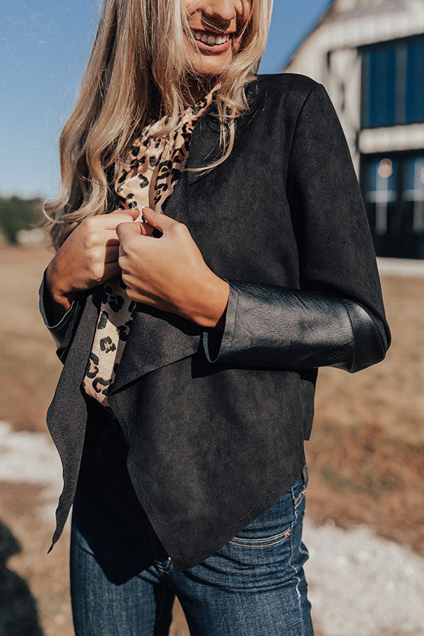 You will undoubtedly look "seriously sleek" when you wear this edgy little black blazer featuring faux suede material with leather accent panels, long semi-loose sleeves, and a draped open front silhouette that falls into a pointed front hemline and a straight back hem! You can pair this ultra warm and versatile piece with just about anything from a basic tank to a bodysuit or dress, jeans to shorts or skirts, booties to wedges or sandals, clutches to totes, and hats to earrings! Measurements