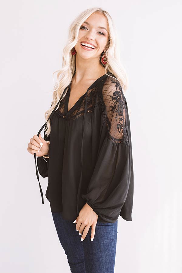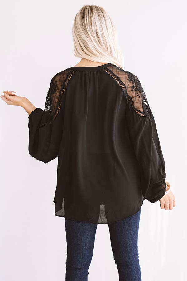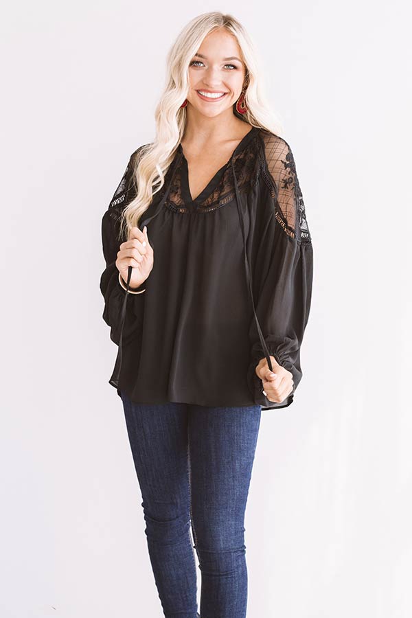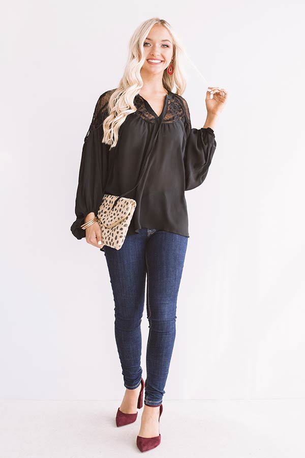 Everyone will be "seriously smitten" with you when you wear this black shift top featuring lightweight material, intricate semi sheer lace detailing on the shoulders and bodice, a v-cut neckline with a tie closure, long oversized bishop sleeves with elastic banded cuffs, and an ultra relaxed bodice that falls into a rounded hemline! This elegant transitional piece can be styled a variety of ways, like with some dark wash ankle skinnies, a cheetah print clutch, and merlot pointed pumps and statement earrings, or with some charcoal flares, "The Jess Faux Leather Heel in Black," and our "All Caught Up Headband in Grey!" Measurements