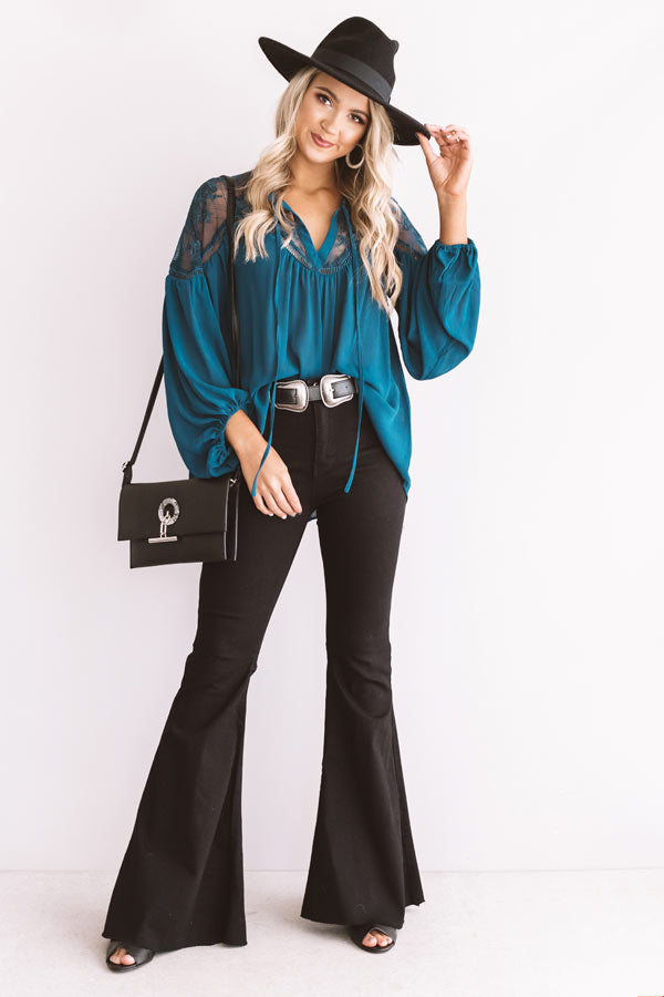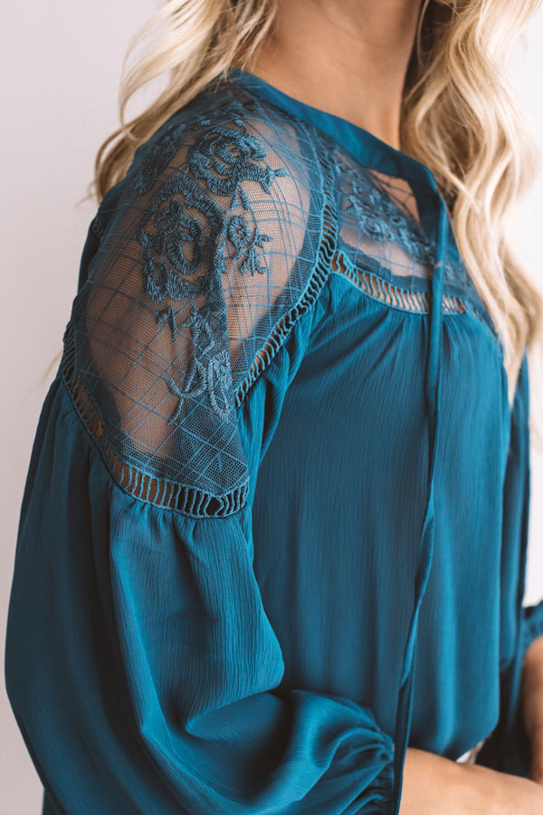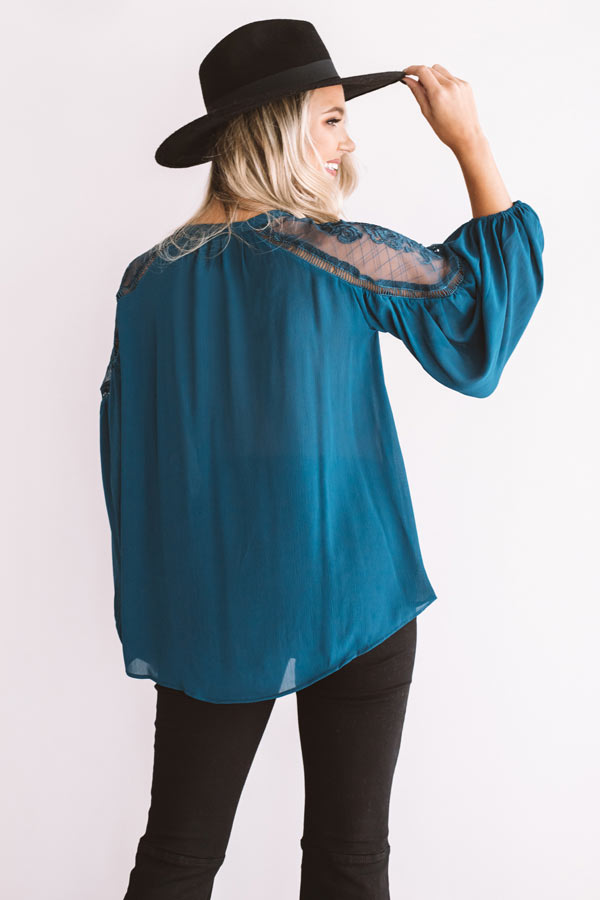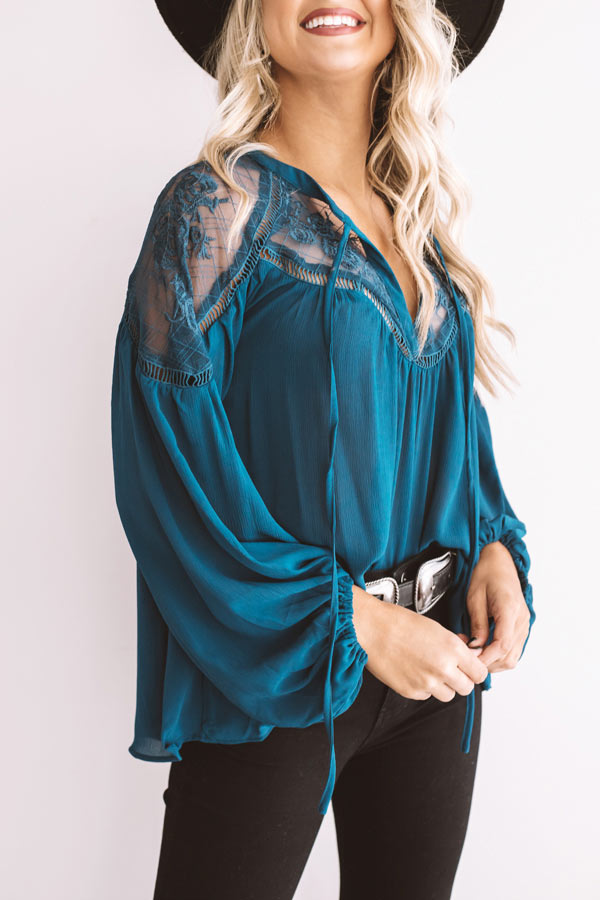 Everyone will be "seriously smitten" with you when you wear this teal colored top featuring lightweight material, intricate semi sheer lace detailing on the shoulders and bodice, a v-cut neckline with a tie closure, long oversized bishop sleeves with elastic banded cuffs, and an ultra relaxed bodice that falls into a rounded hemline! This elegant transitional piece can be styled a variety of ways, like with some oversized black flares, a statement belt, and a black peep toe heel, crossbody, and faux suede hat, or with some light wash distressed ankle skinnies, "The Seraphina Faux Leather Wedge in Taupe," and our "By Request Tassel Earrings in Taupe!" Measurements