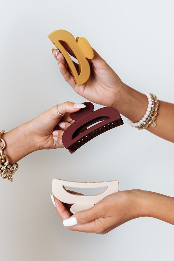 You will absolutely be serving up major looks when you complete your hair style with this chic hair claw clip set featuring three rectangular silhouette pieces: a maroon, cream, and mustard one!