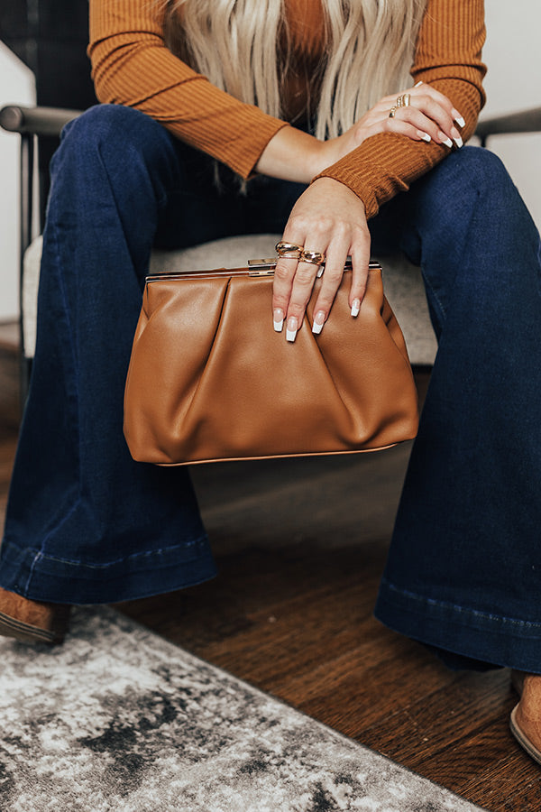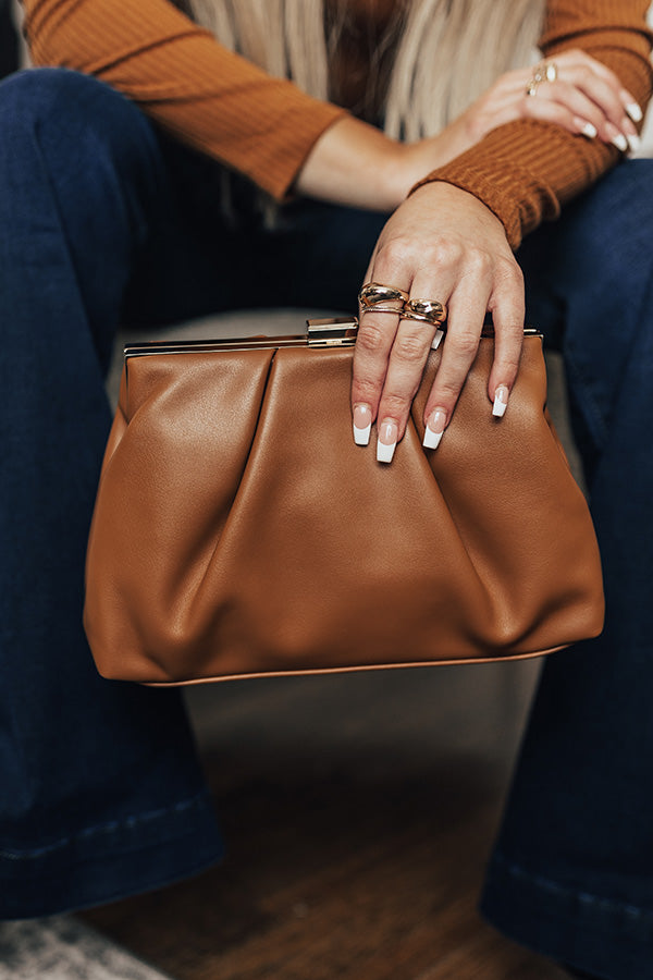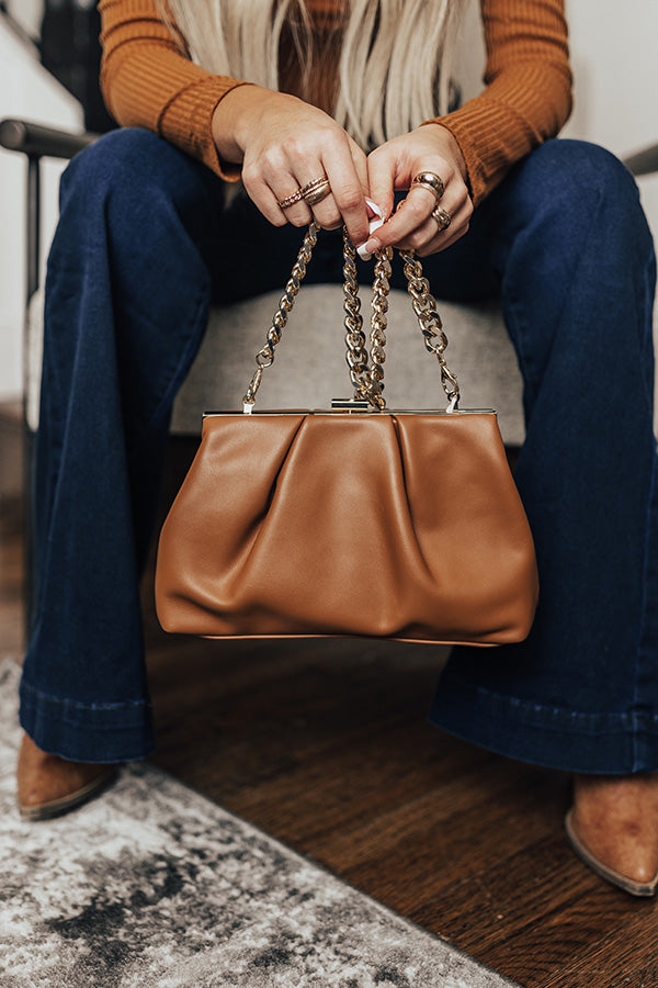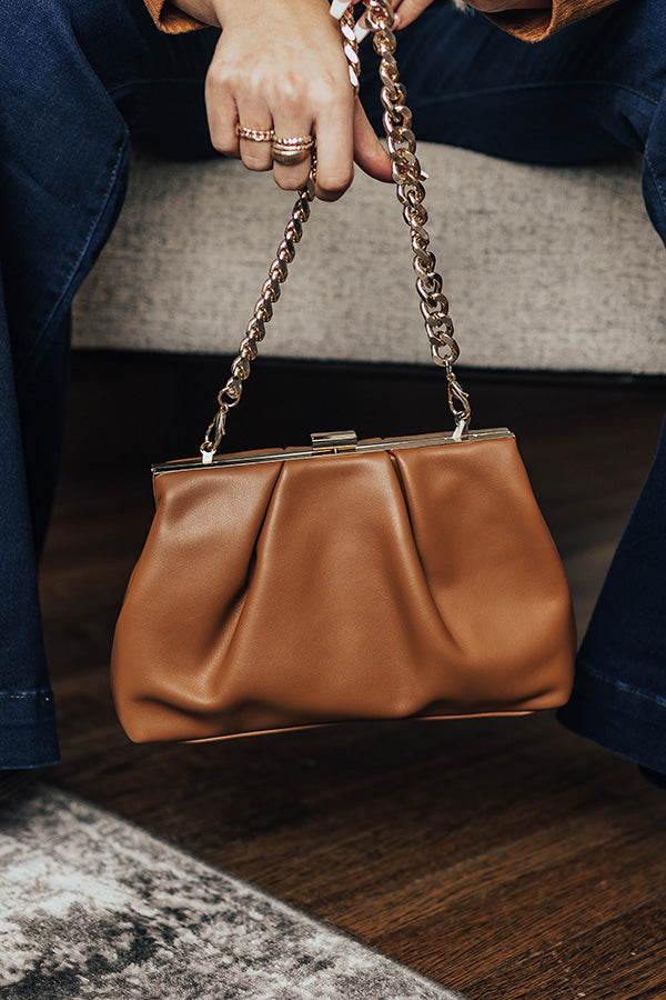 You will be serving up sass when you carry this trendy camel colored clutch featuring faux leather material, a pressure clasp closure, a removable chain link shoulder strap, and a spacious fully lined pouch with an additional inside zip closure pocket!