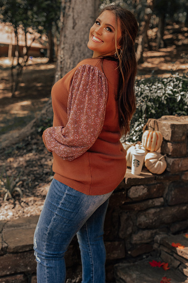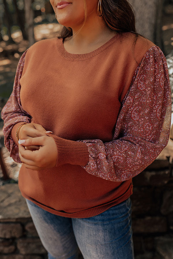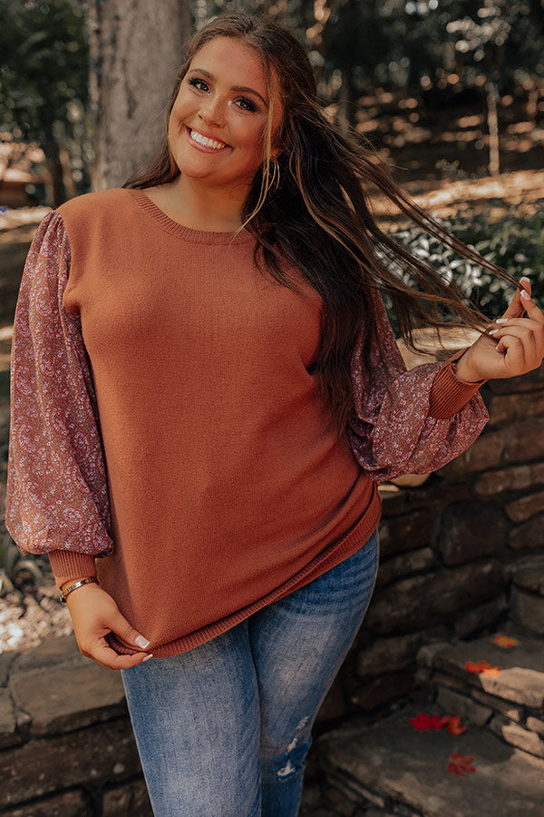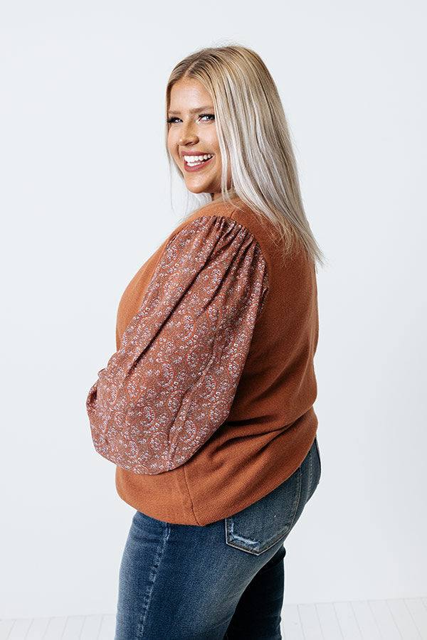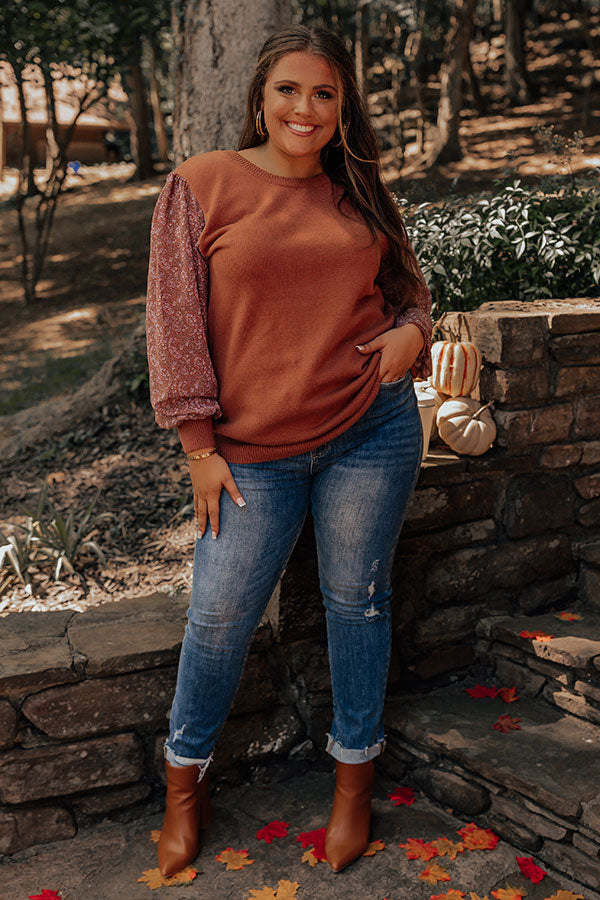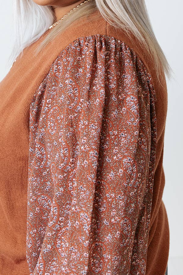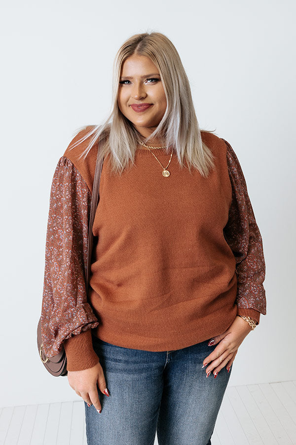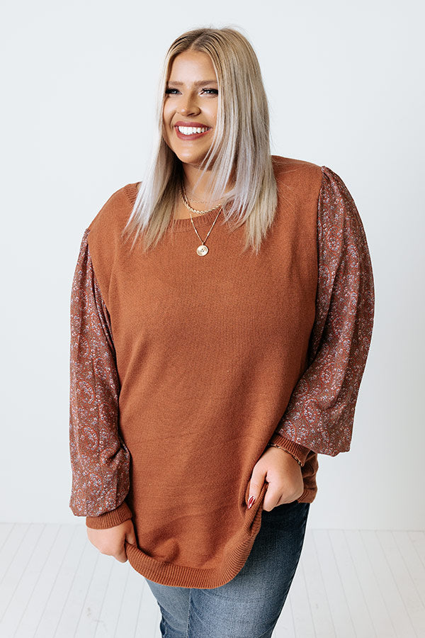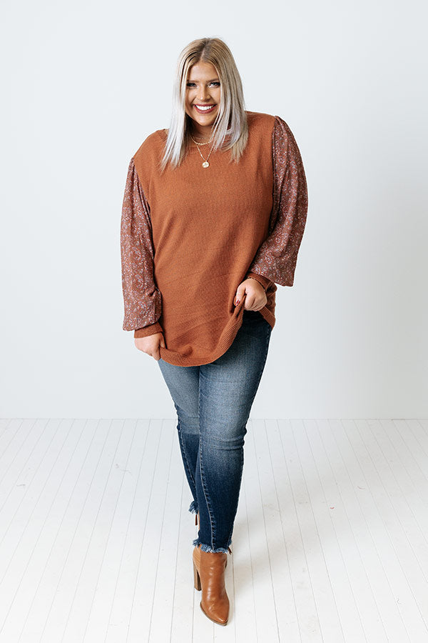 You will be serving up a majorly spicy look when you arrive in this flirty plus size cinnamon colored sweater featuring soft material, long bubble sleeves patterned with a small pink hued floral print and fitted cuffs, a rounded neckline, and a relaxed silhouette that falls into a straight hemline!